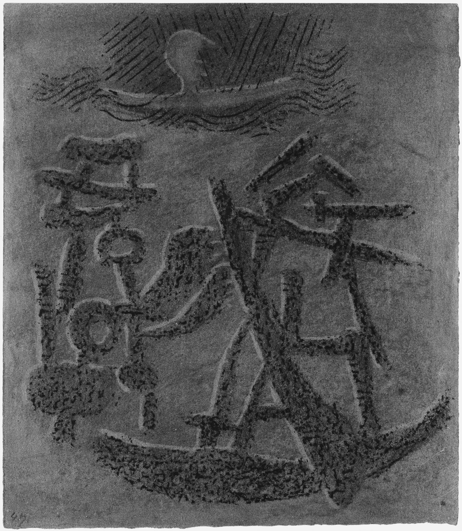 Kohle, gewischt, radiert, Ölkreide in Schwarz, durchgerieben, fixiert, auf hellbraunem Tonpapier