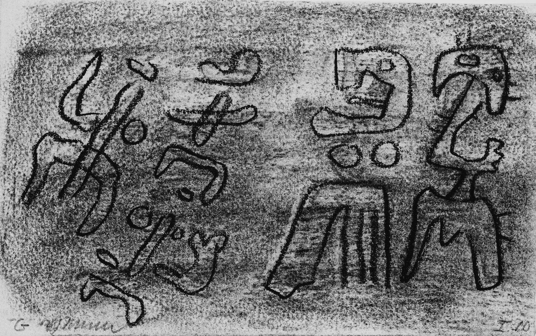 Vgl. Z 951. 950-954: Eine Reihe von Varianten und Vorarbeiten zur Illustration IX (Z 872), die den Arbeitsprozeß verdeutlichen: Auf Z 950 und 951 ist jeweils die volle Szene zu erkennen; rechts im Bild kommen Gilgamesch und Enkidu in die Stadt, links die tanzenden Mädchen. Bei Z 951 wurde die Durchreibetechnik noch in der Frühform über einem Holzbrett ausgeführt. Z 952 variiert nur die beiden Figuren rechts, Z 953 lediglich den Tanz der Mädchen. Z 954 schließlich zeigt eine ins Negativ gewendete Version der endgültigen Illustration der Folge.