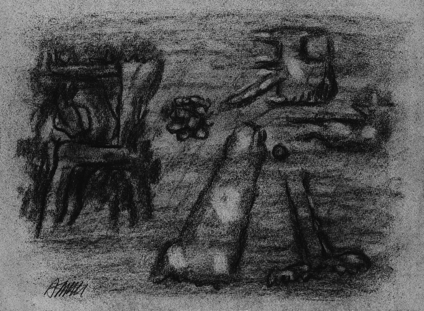 Kohle, gewischt, radiert, fixiert, auf ziegelrotem Ingres-Bütten