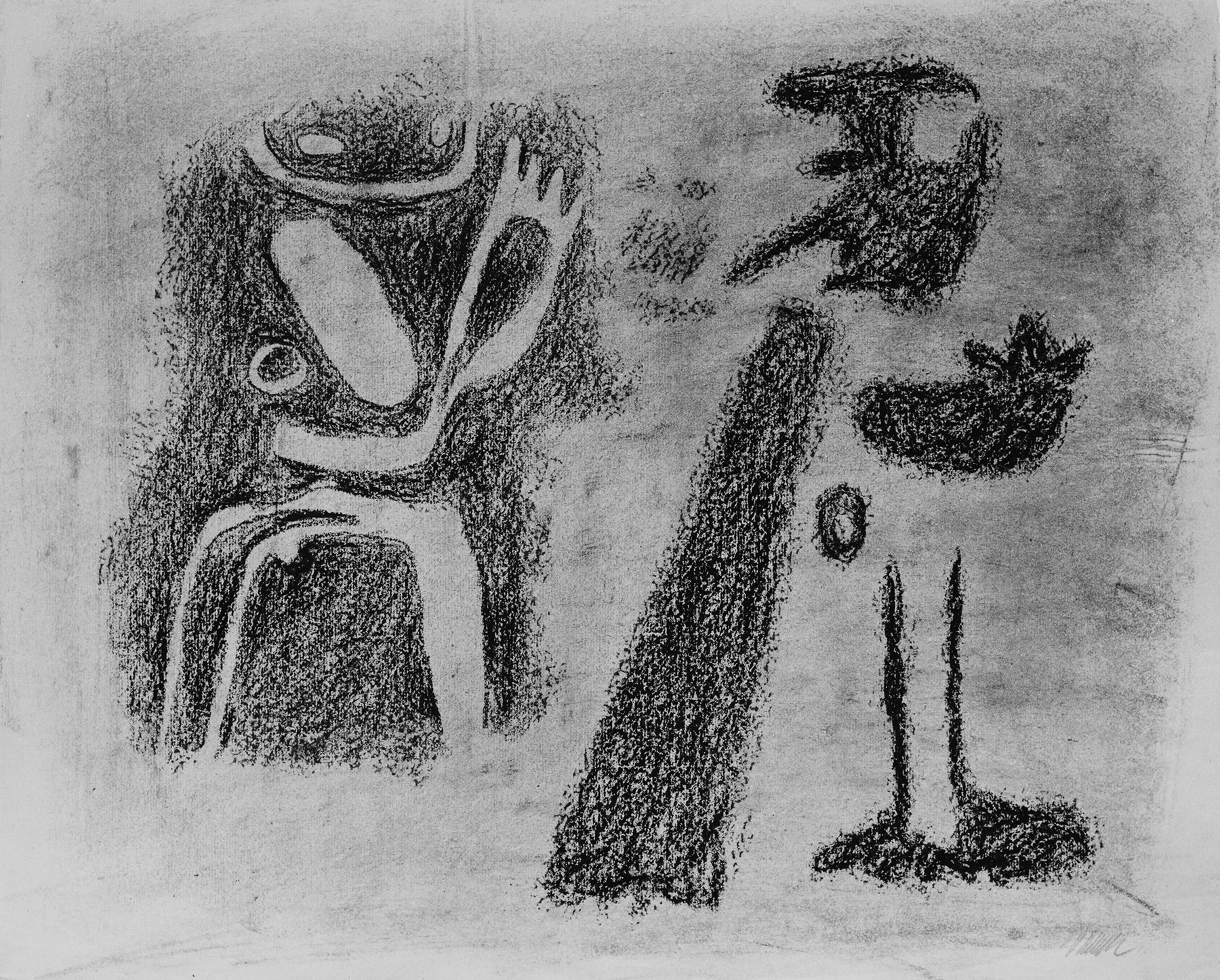 Kohle, gewischt, Ölkreide in Schwarz, durchgerieben, fixiert, auf gelblichem Ingres-Bütten