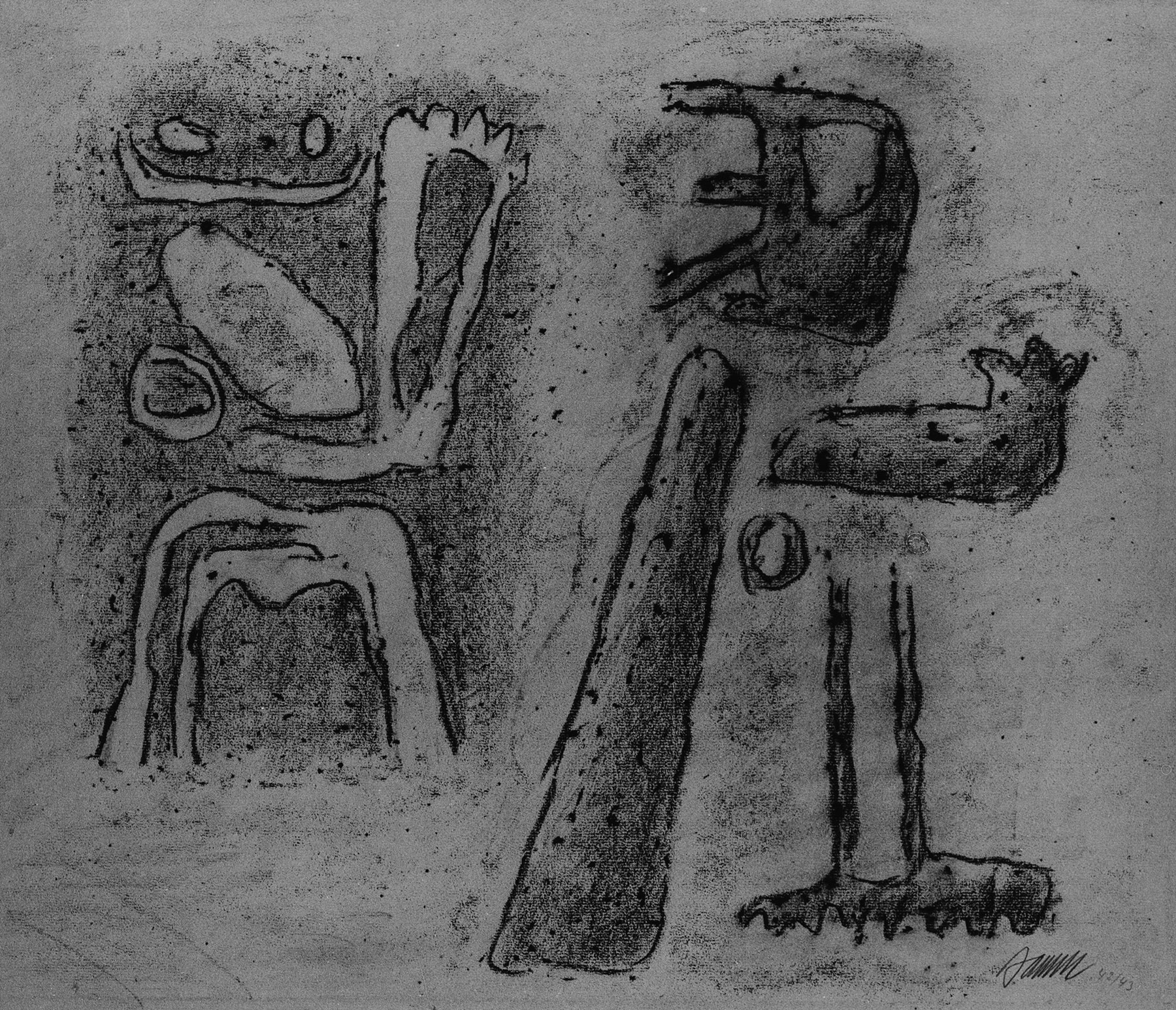 Ölkreide in Schwarz, Braun, z. T. mit nassem Stift durchgerieben, z. T. gespritzt, auf olivgrünem Ingres-Bütten mit Wz. r. o.: INGRES und l. o.: PMF (ITALIA), beide beschnitten