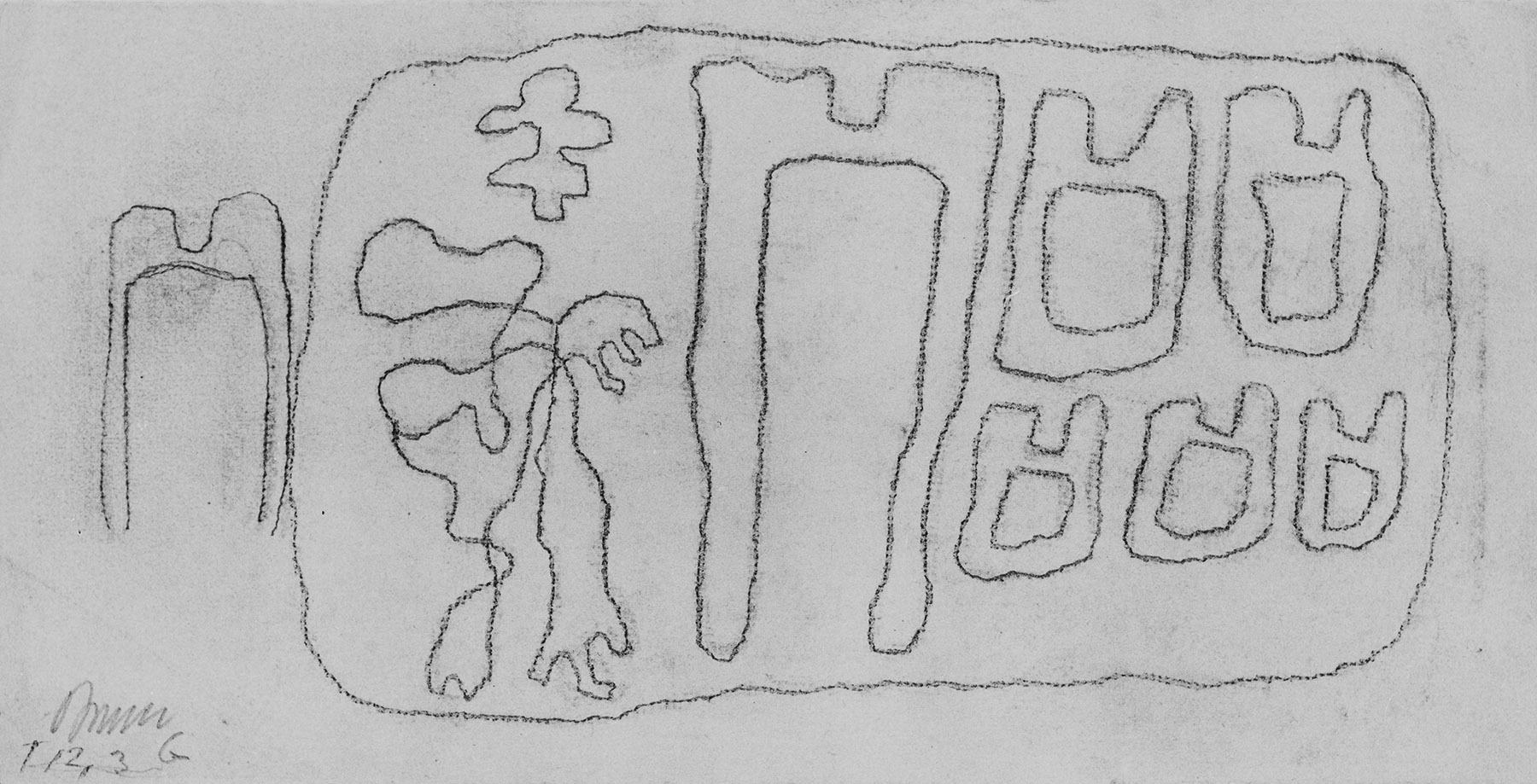 Papier stark gebräunt. Bleistift beim Durchreiben stark ins Papier gedrückt. Rand r. und l. verknickt. besonders Ecke l. unten.