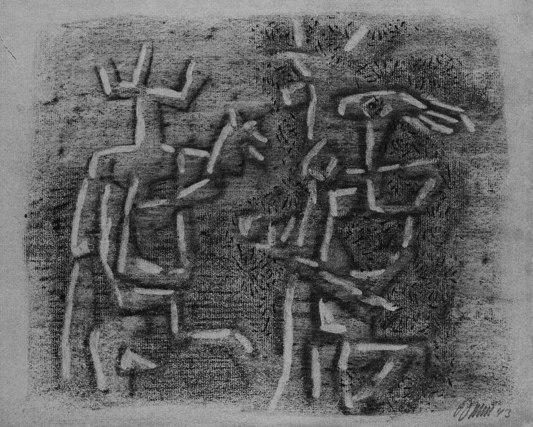 Kohle, gewischt, radiert, Ölkreide in Schwarz, durchgerieben, fixiert, auf mittelbraunem, am Rand l. unregelmäßig gerissenem Ingres-Bütten mit Wz. r. u.: PMF (ITALIA)