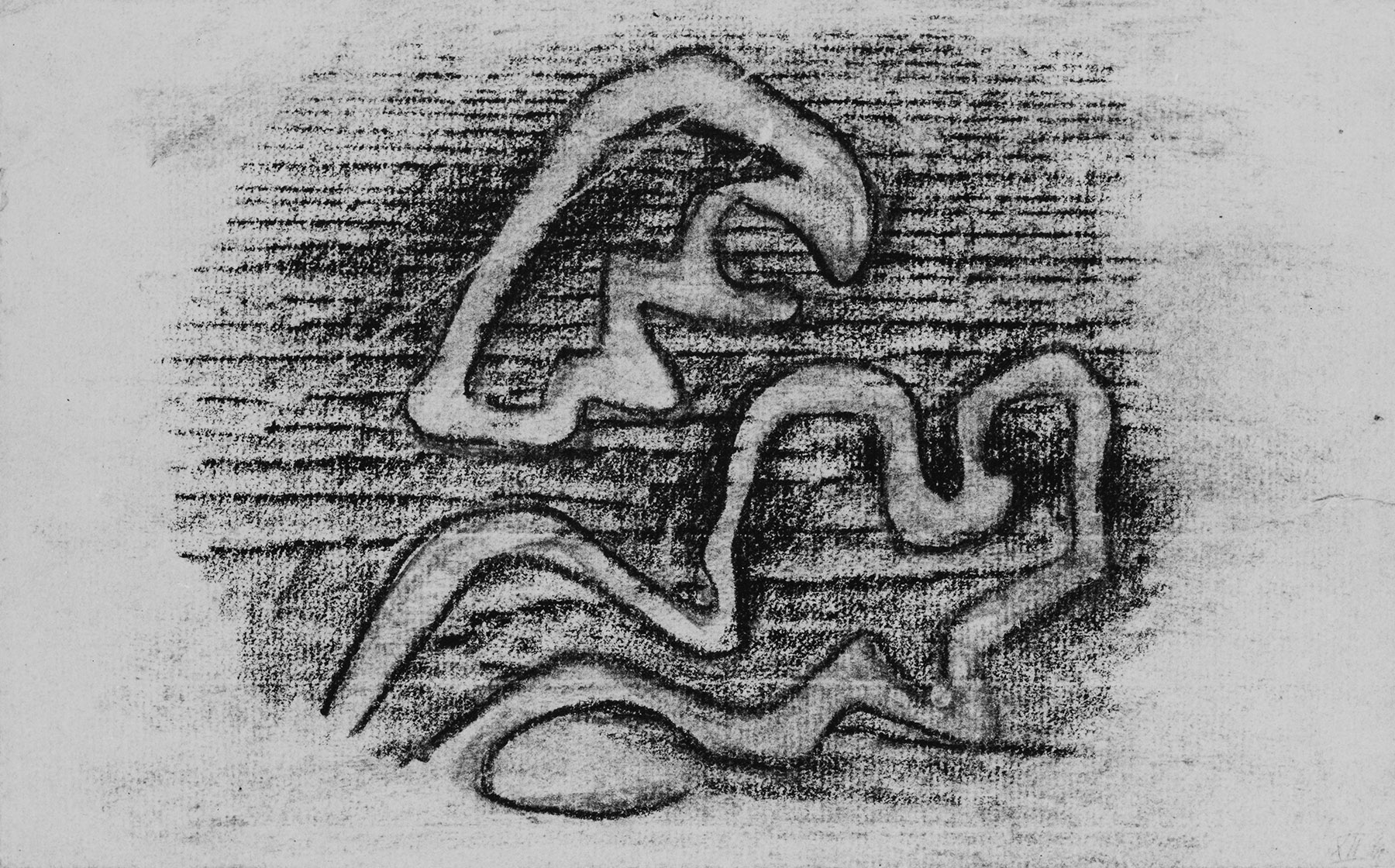 Kohle, gewischt, Ölkreide in Schwarz, z. T. durchgerieben, fixiert, auf chamoisfarbigem bis hellbeigefarbigem, am Rand o. leicht unregelmäßig ausfransend gerissenem, r. unregelmäßig beschnittenem Ingres-Bütten