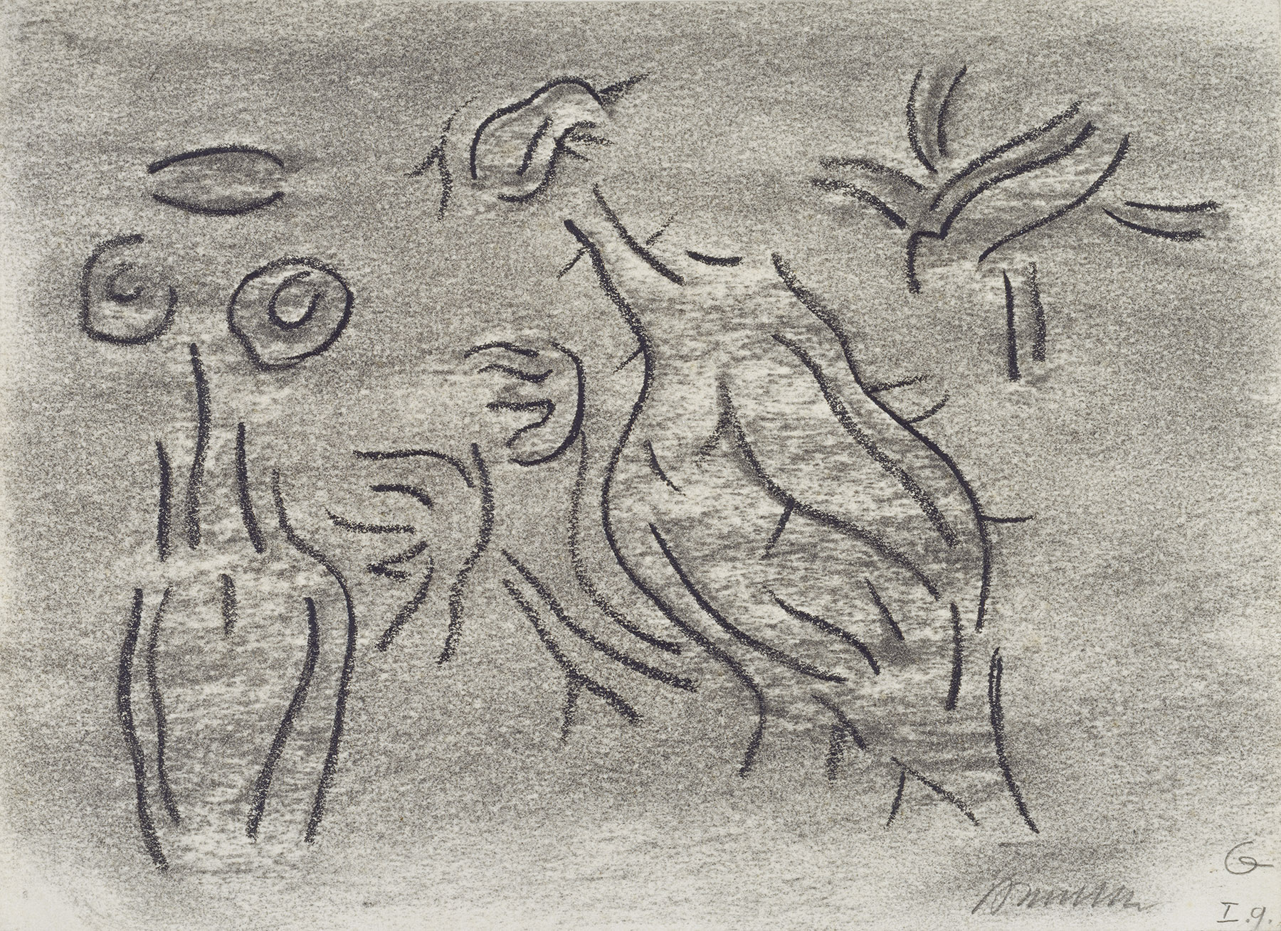 Kohle, gewischt, Ölkreide in Schwarz, fixiert, auf chamoisfarbigem Zeichenkarton