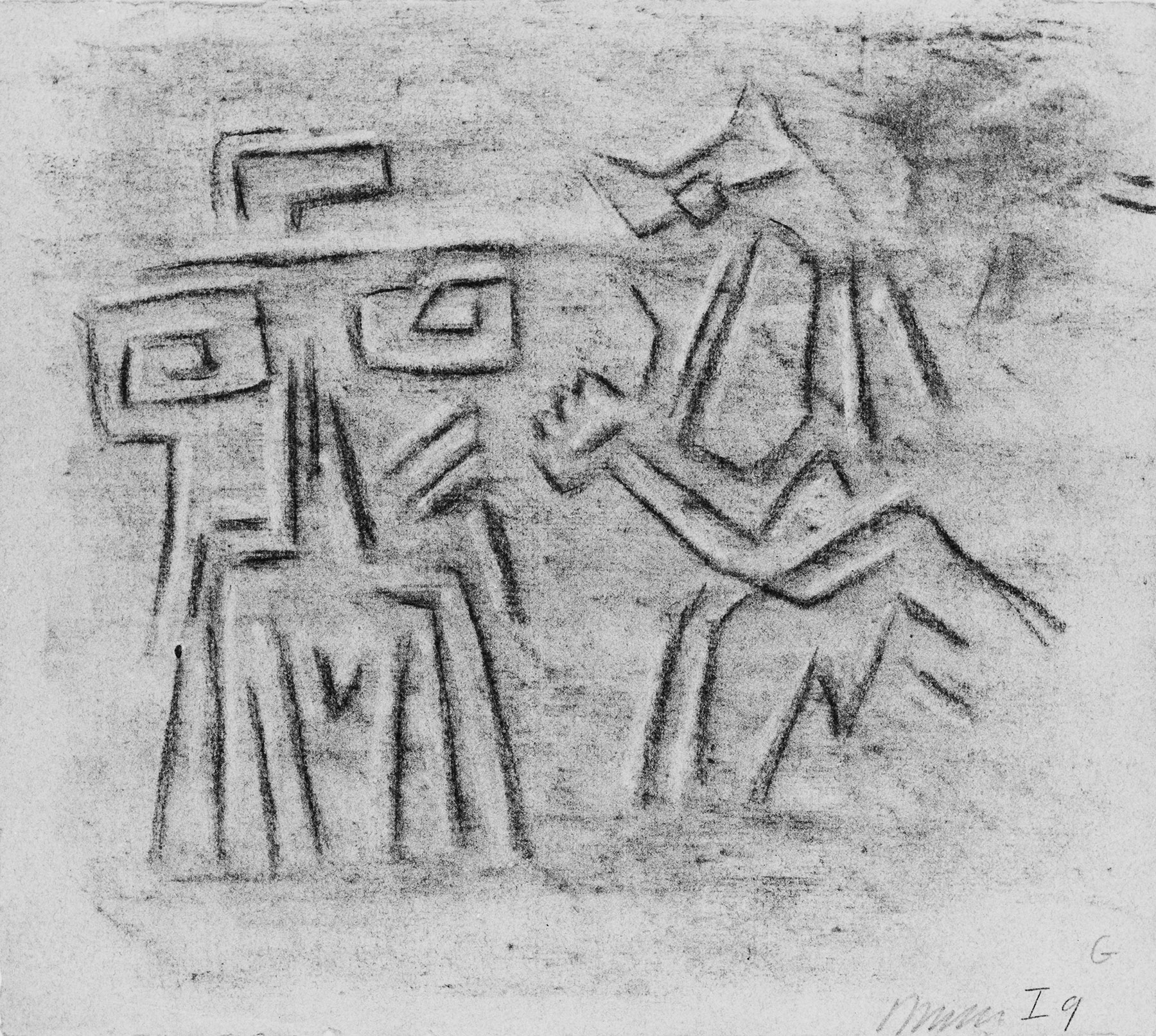 Kohle, gewischt, radiert, fixiert, auf lichtblauem, am Rand l. leicht fransend abgetrenntem Ingres-Bütten mit Wz. r. o.: Hahn im Kreis
