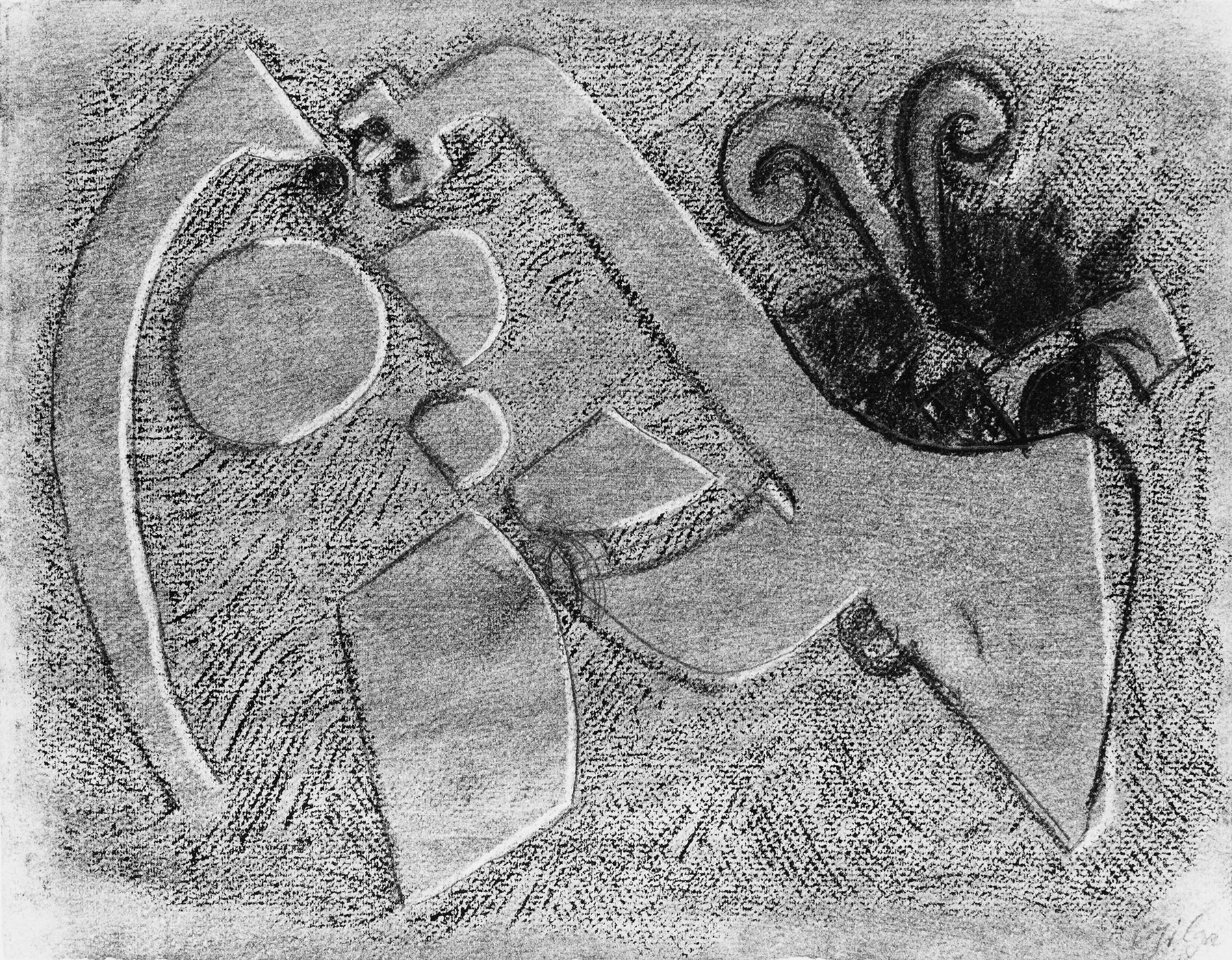 Kohle, gewischt, radiert, Ölkreide in Schwarz, durchgerieben, Bleistift (Konturen eindrückend übergangen), auf chamoisfarbigem, am Rand u. leicht unregelmäßig gerissenem Ingres-Bütten mit Wz. l. o.: INGRES