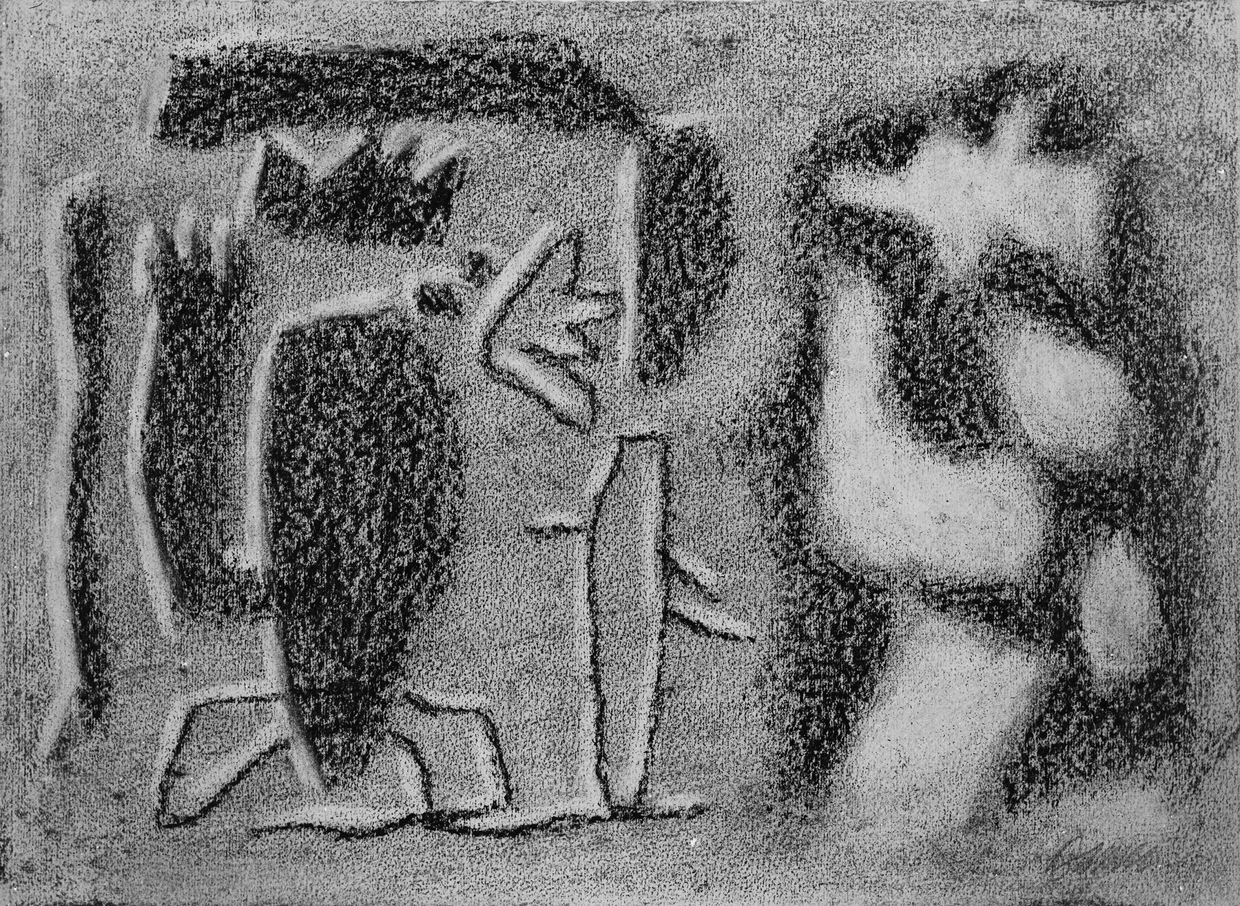 Kohle, gewischt, radiert, Ölkreide in Schwarz, durchgerieben, in Grün, Rot, fixiert, auf rötlichbraunem, am Rand r. und l. leicht unregelmäßigem Ingres-Bütten