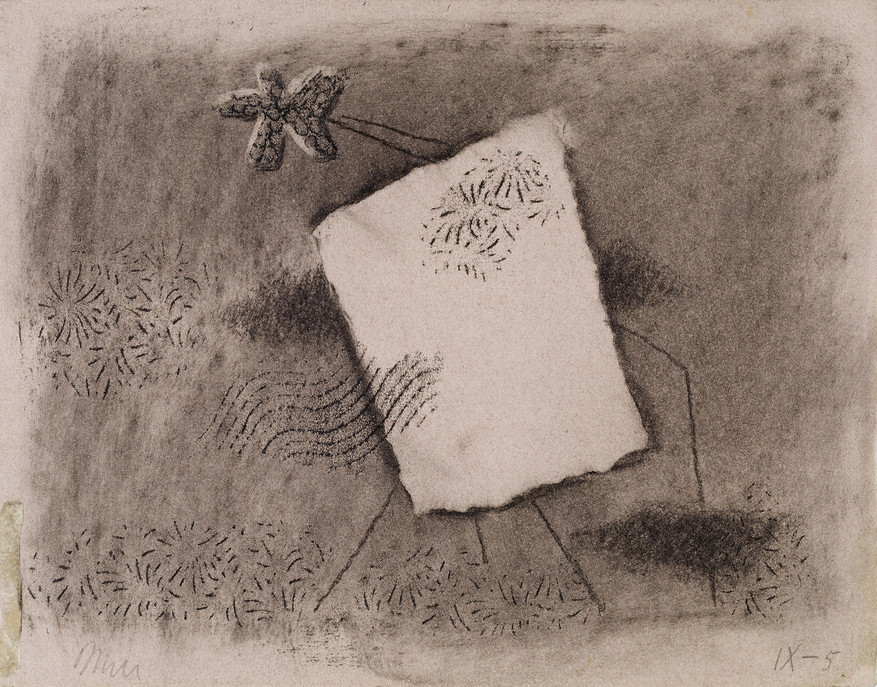 Kohle, gewischt, radiert, Ölkreide in Schwarz, durchgerieben, fixiert, auf rosafarbigem, am Rand o. im scharfen Knick zur Ecke l. unregelmäßig gerissenem Ingres-Bütten mit Wz. r. u.: INGRES. In der Mitte wurde die Kohle über die Ränder eines gerissenen, f