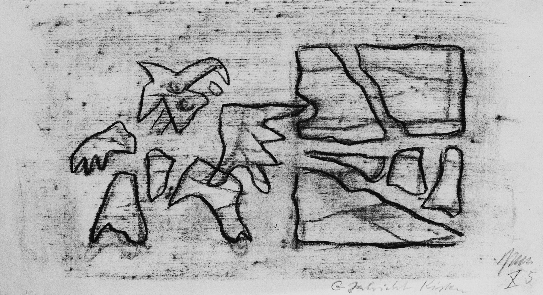 Kohle, gewischt, Ölkreide in Schwarz, fixiert, auf chamoisfarbigem Ingres-Bütten