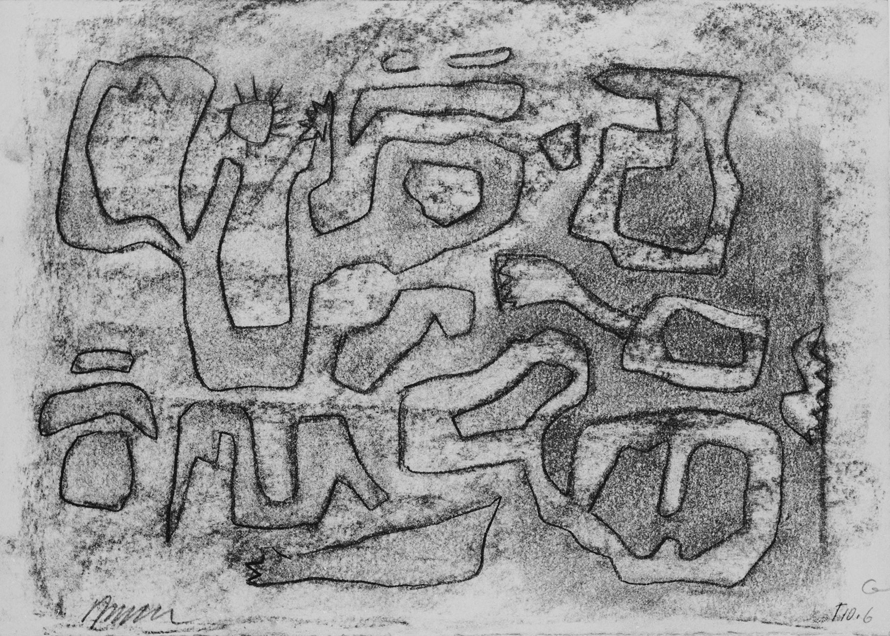 Kohle, gewischt, Ölkreide in Schwarz, Bleistift, fixiert, auf chamoisfarbigem, am Rand I. perforiertem, am Rand u. im scharfen Knick unregelmäßig abgetrenntem Zeichenkarton