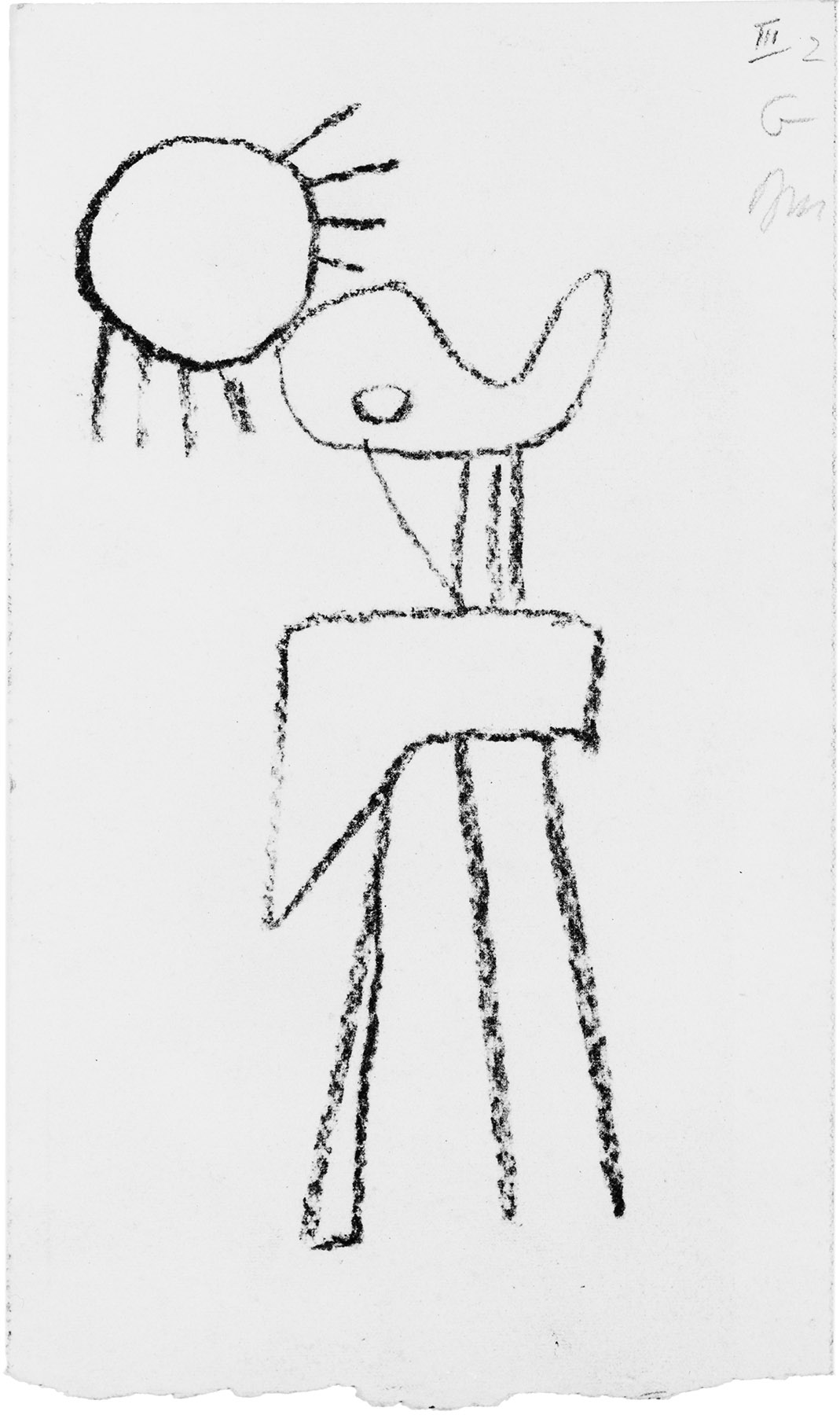 Das Blatt zeigt die Gilgamesch-Illustration XVI im Hochformat in auffallend einfacher Umsetzung. Wie wichtig sie dennoch für B. gewesen ist, zeigen die Signatur und die Bezeichnung in der rechten oberen Ecke.