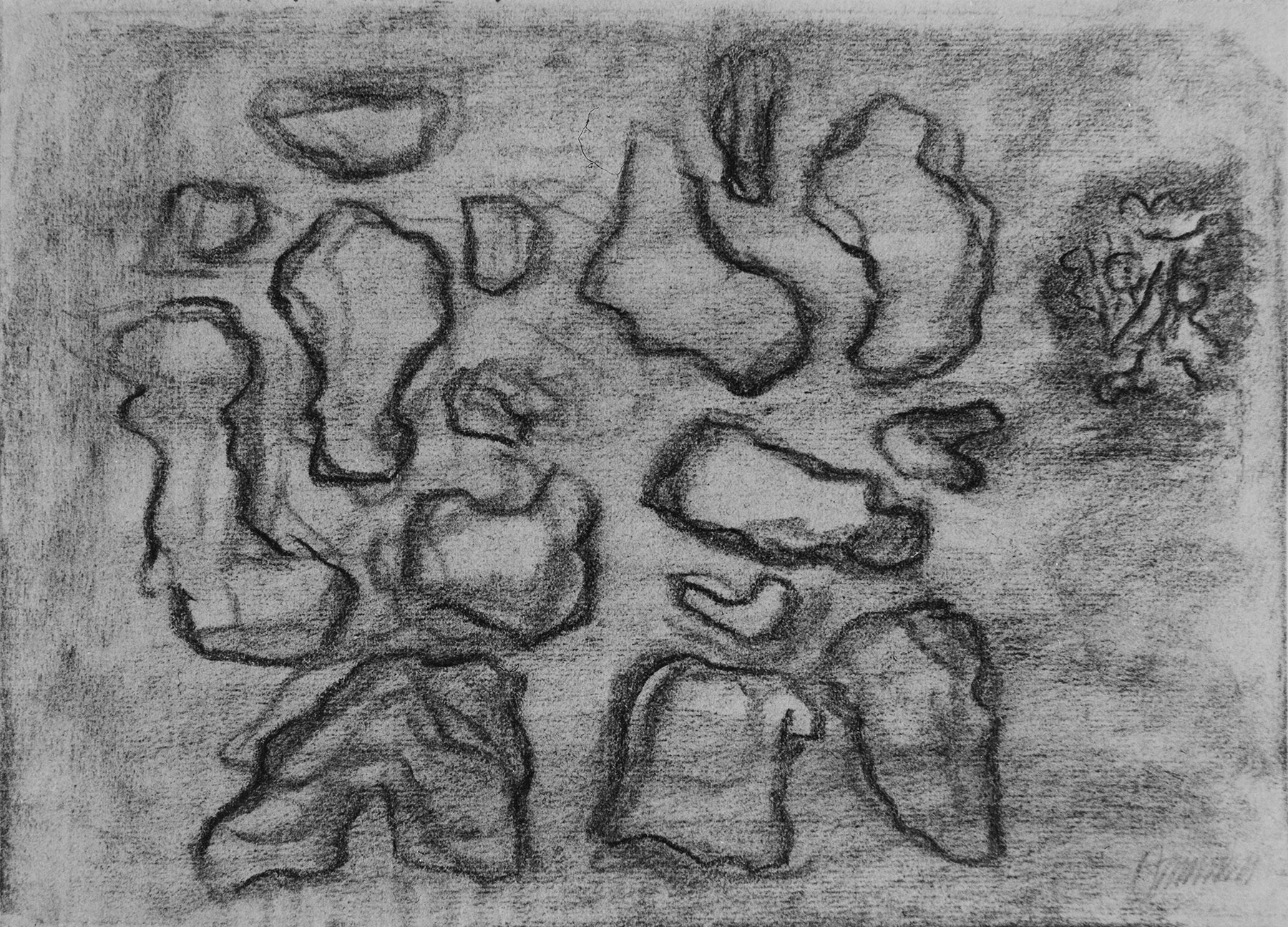 Vgl. die Lithographie Sp 147 von 1947 mit der Textstelle „Uns hat Schamasch geheißen, zu streiten gegen Chumbaba“ (IV, 17). (fkb)   981-988: Die Figurationen der Blätter Z 981 und 982 stehen, wie bei Z 984 und 987, in positiv-negativem Wechselverhältnis. Bei Z 988 wird die Umkehrung durch verschiedene Strukturen verursacht. In den übrigen Kompositionen erscheinen die Durchreibungen im Hintergrund. Nur im ersten Fall, Z 981, werden die Formgebilde in Frottagetechnik ausgeführt, während der Hintergrund durch Wischen tonig gehalten ist.