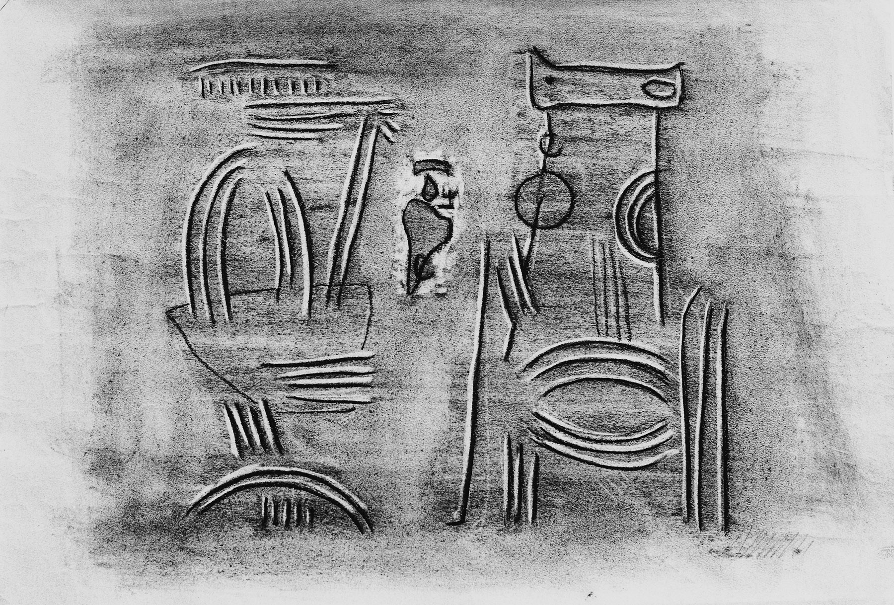 Kohle, gewischt, radiert, Ölkreide in Schwarz, fixiert, Ritzkonturen blind, auf gelblichem Zeichenpapier