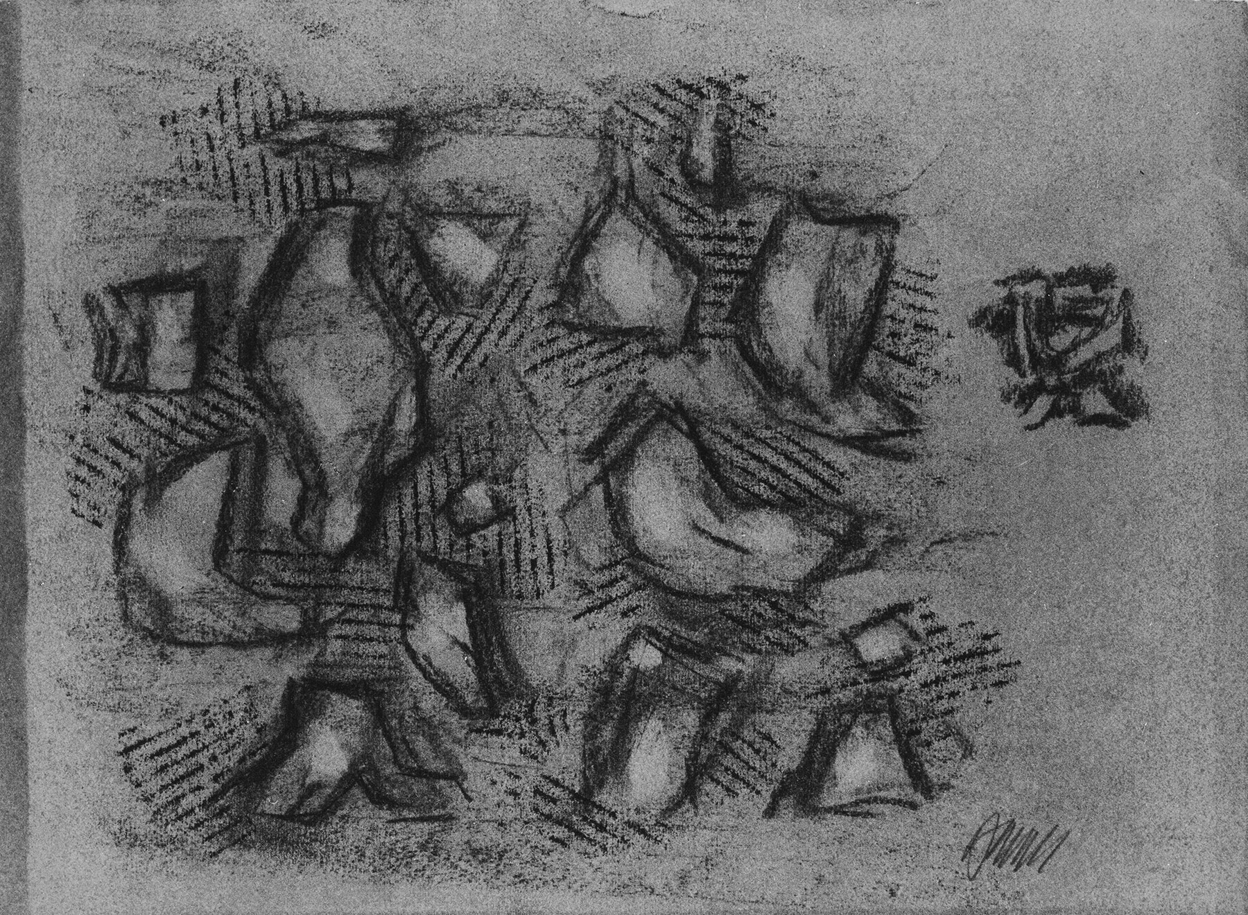Vgl. die Lithographie Sp 147 von 1947. - Vgl. wie bei Z 983. (fkb) Auf Grund der eigenhändigen Datierung des rückseitigen Fragments einer größeren Komposition von 1946 kann die Zeichnung auf der Vorderseite nicht früher angesetzt werden. Sie ist in den Zusammenhang der Lithographienserie von 1947 zu stellen.