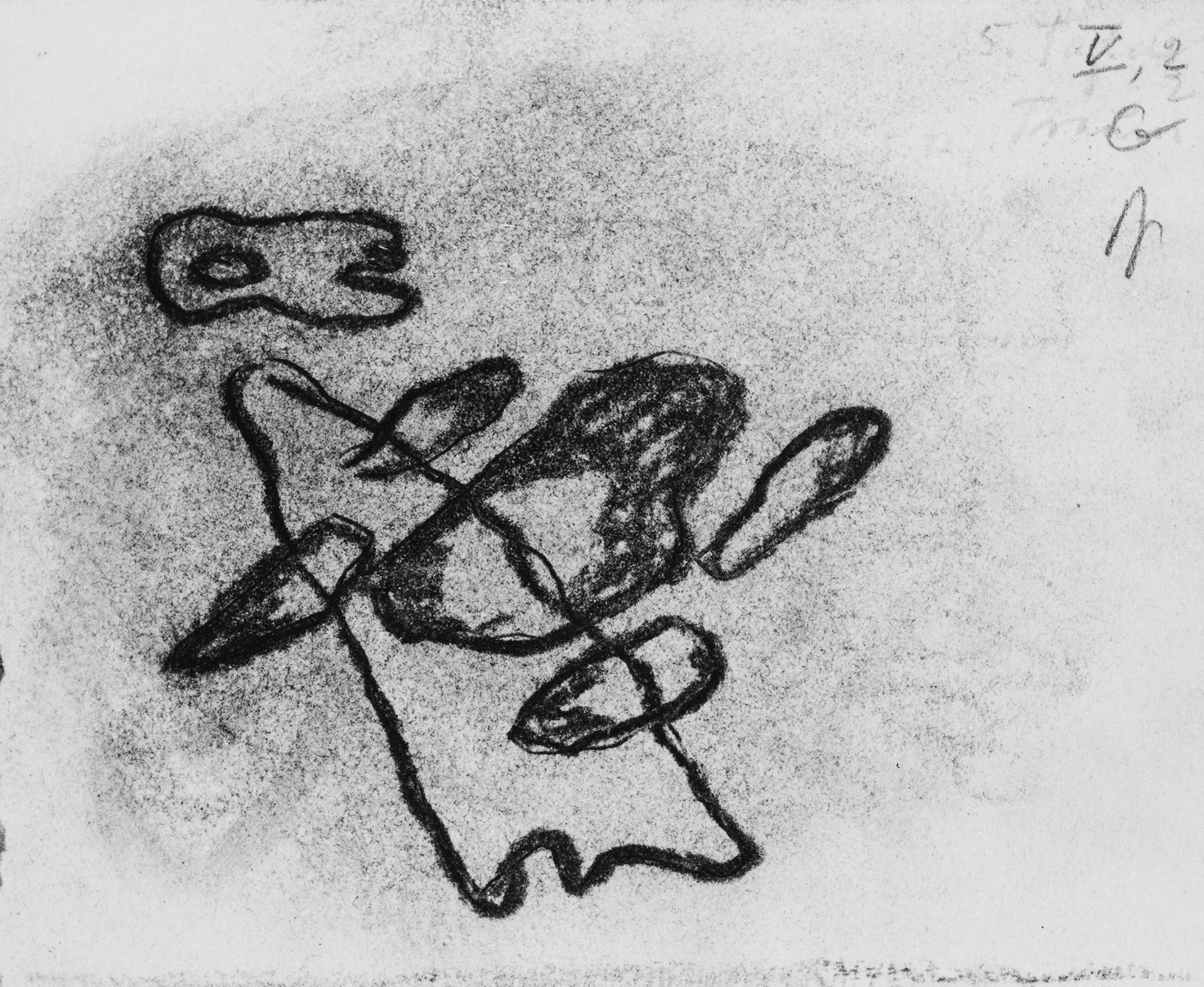 Vgl. Z 1410 in bezug auf die Figur rechts unten. (fkb) - Die Komposition wird bestimmbar durch die Bezeichnung rechts oben. Dieses Blatt - ähnlich Z 973 - scheint, aus einem Skizzenbuch gerissen, die erste Stufe der Arbeit für den Zyklus zu dokumentieren. In dieser frühen, doch ausgeschiedenen Illustration sind noch Eidosformen der Jahre 1938/39 zu erkennen. Die bei der Schlußredaktion in den Zyklus aufgenommene Zeichnung weist einen völlig anders entwickelten Formenkanon auf.