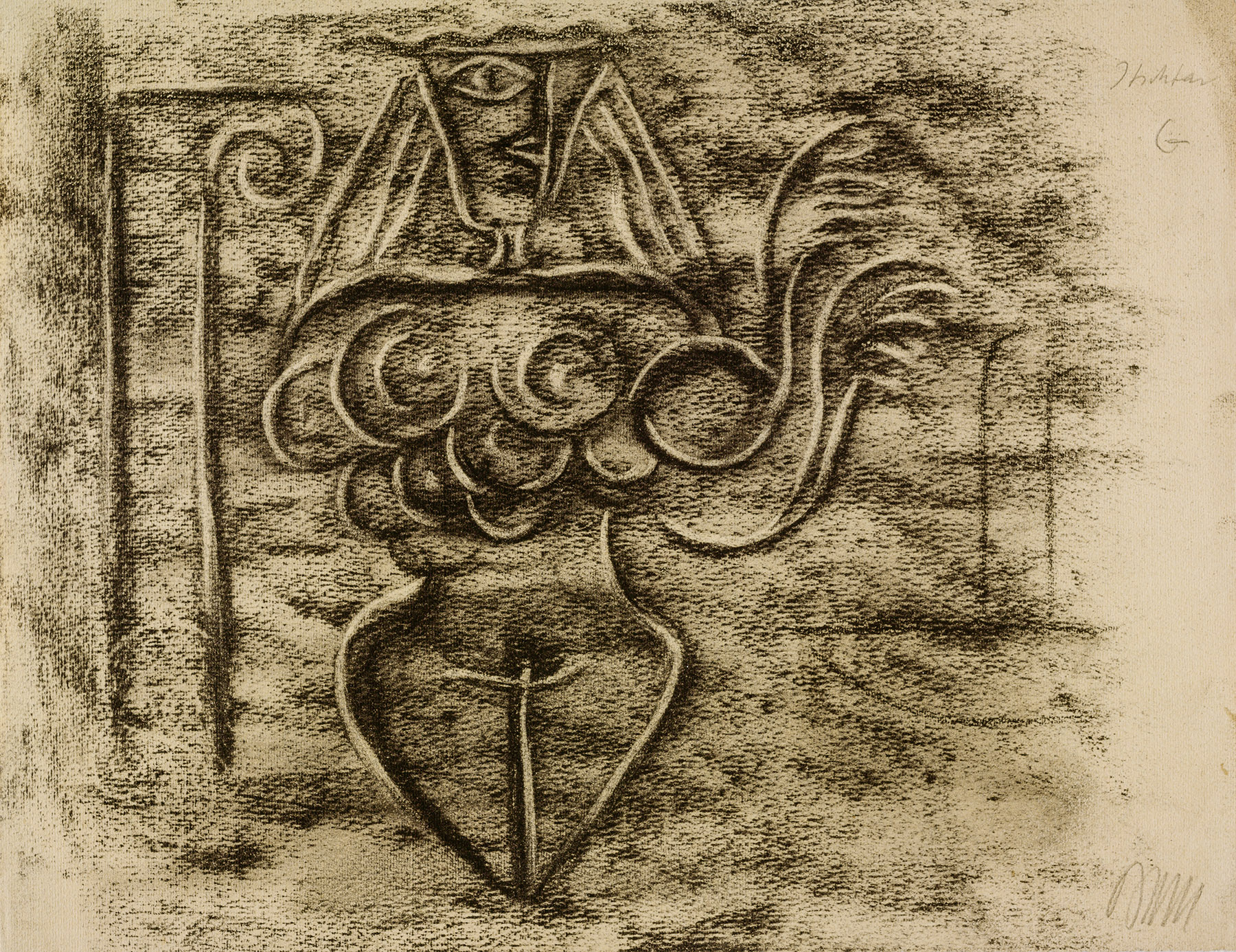 Kohle, gewischt, radiert, fixiert, auf maisgelbem, am Rand o. unregelmäßigem Ingres-Bütten mit Wz l. u.: Kartusche