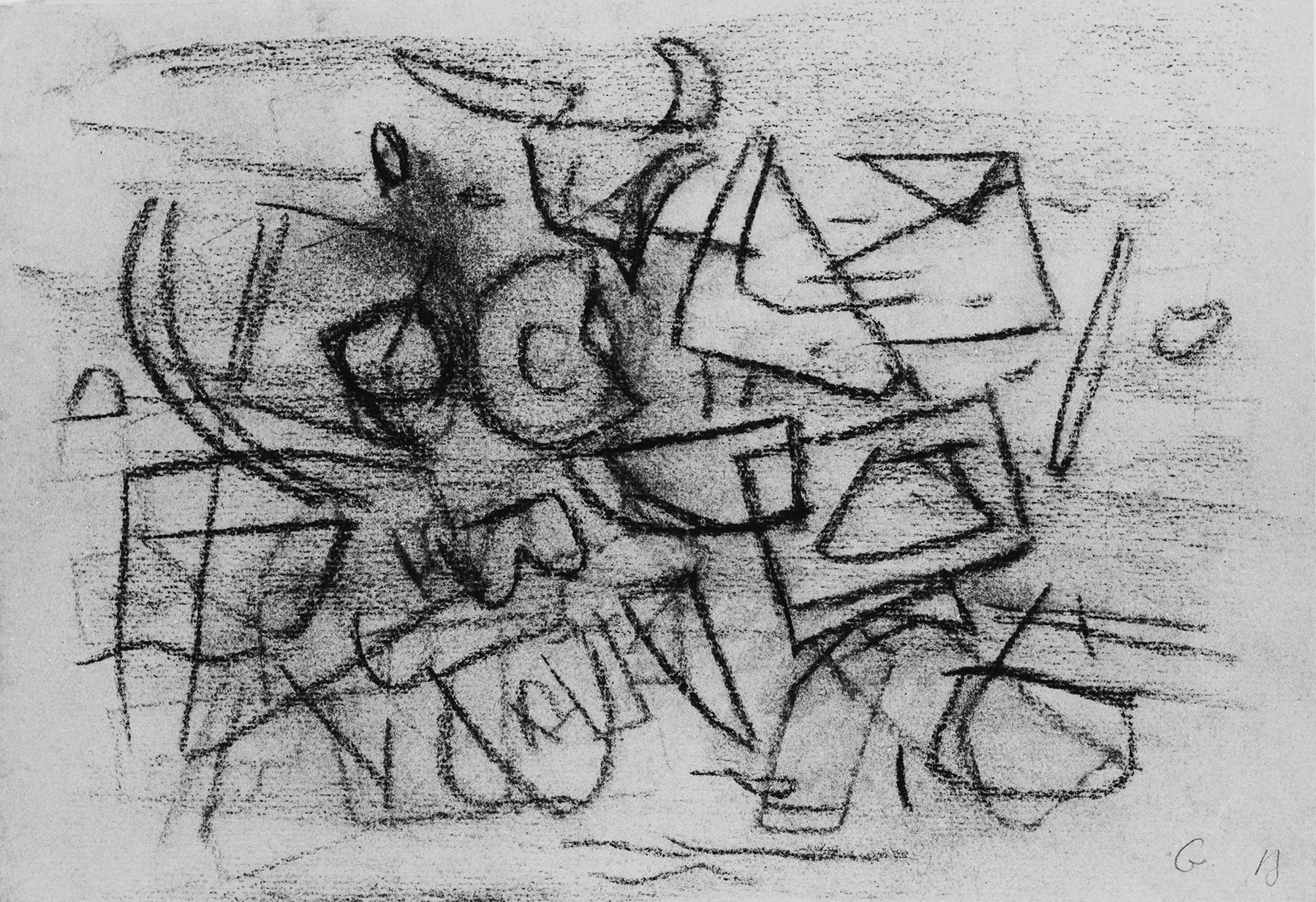 Kohle, z. T. gewischt, fixiert, auf chamoisfarbigem bis hellgrauem, am Rand u. unregelmäßig abgetrenntem Ingres-Bütten