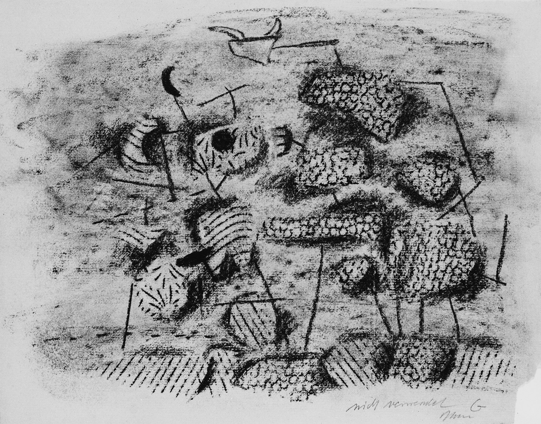 Kohle, gewischt, Ölkreide in Schwarz, durchgerieben, fixiert, auf maisgelbem Ingres-Bütten mit Wz. r. o.: INGRES