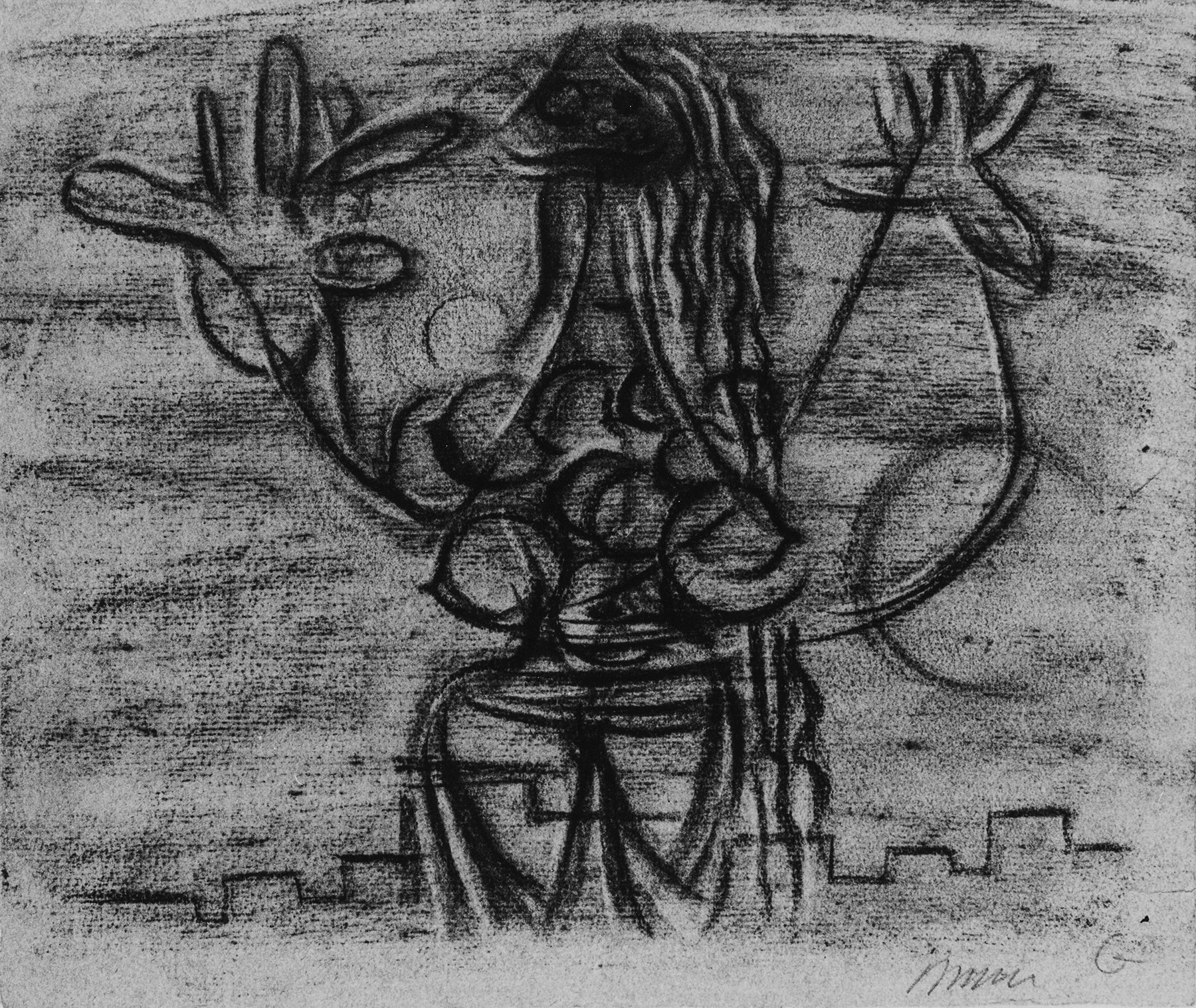 Kohle, gewischt, radiert, fixiert, auf rosafarbigem Ingres-Bütten mit Wz. l. o.: Ingres [sic]