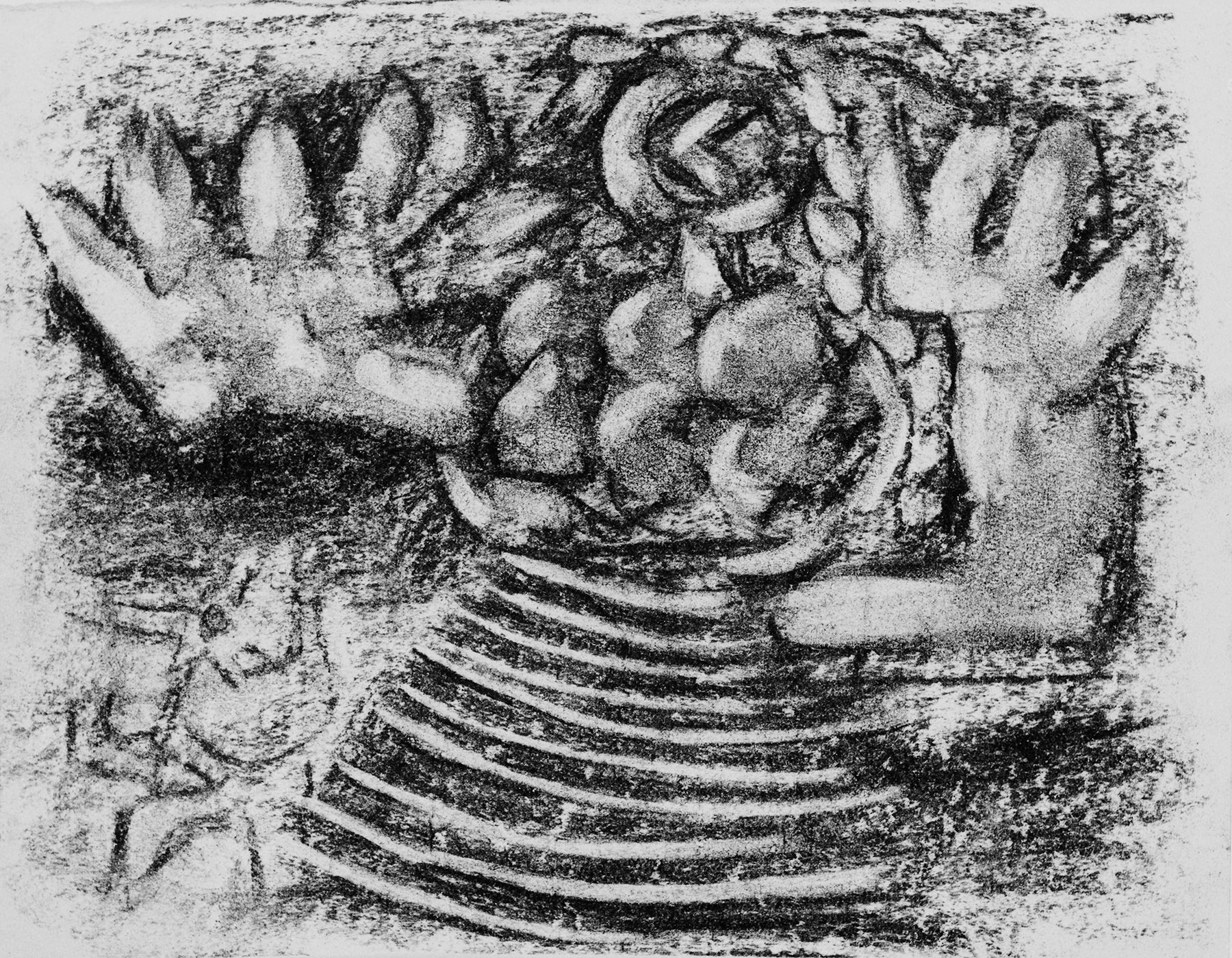 Kohle, gewischt, radiert, fixiert, auf chamoisfarbigem, genarbtem, am Rand o. unregelmäßig im scharfen Knick gerissenem, am Rand u. leicht unregelmäßig beschnittenem Aquarellkarton