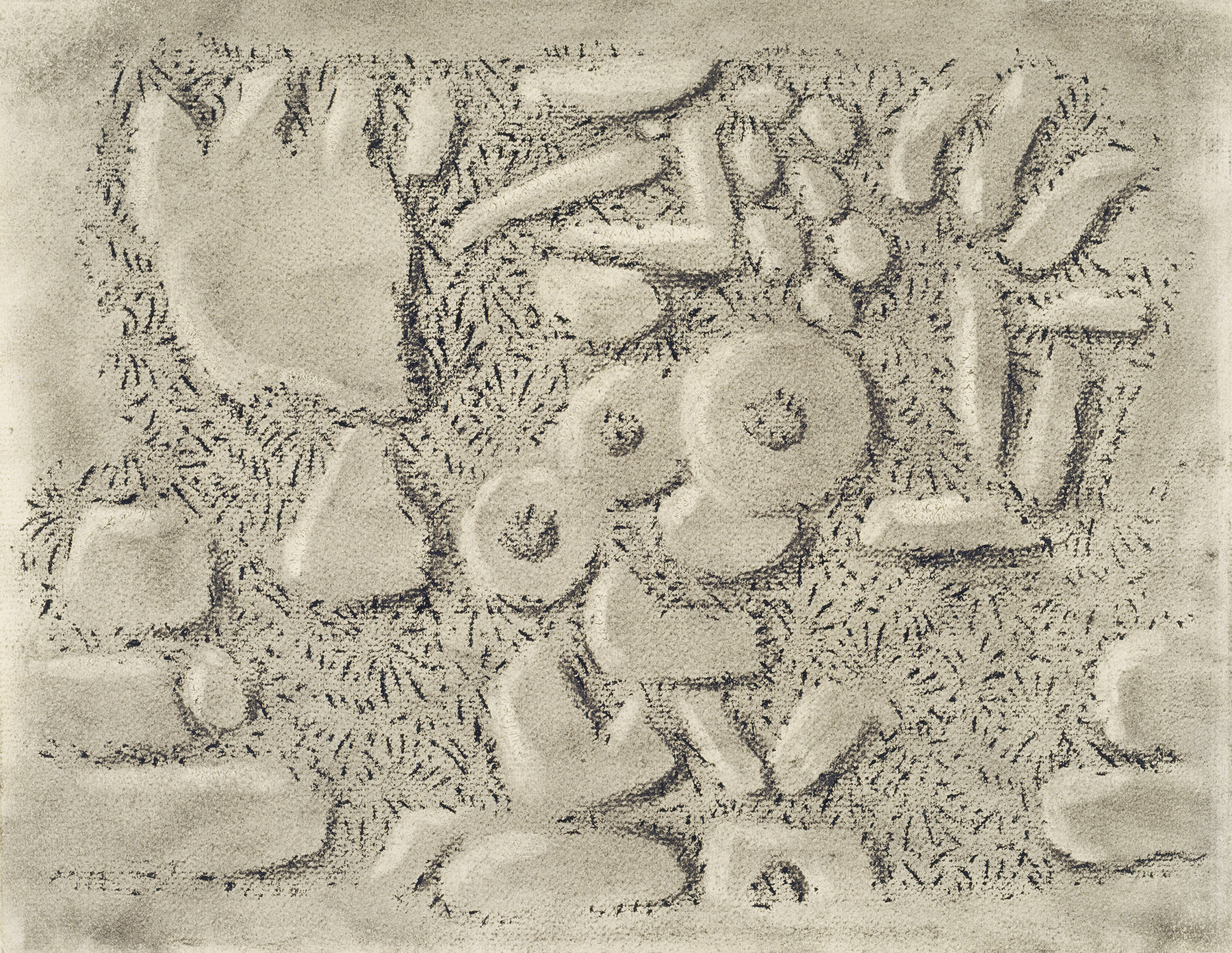 Kohle, gewischt, radiert, Ölkreide in Schwarz, durchgerieben, fixiert, auf chamoisfarbigem, am Rand o. leicht unregelmäßig gerissenem Ingres-Bütten mit Wz. l. u.: Kartusche