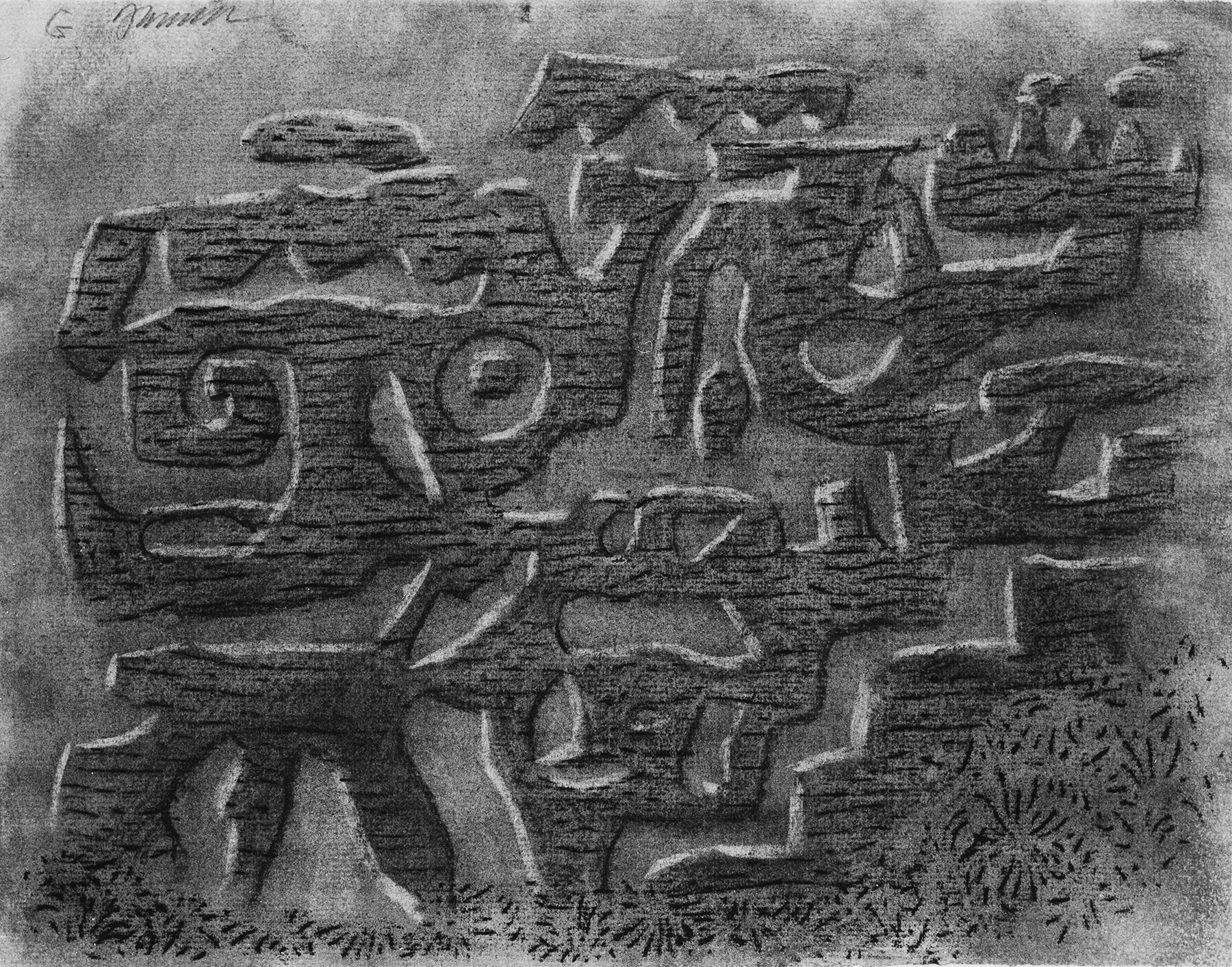 Kohle, gewischt, radiert, Ölkreide in Schwarz, durchgerieben, fixiert, auf grauem, am Rand u. leicht unregelmäßigem Ingres-Bütten mit Wz. r. o.: PMF (ITALIA)