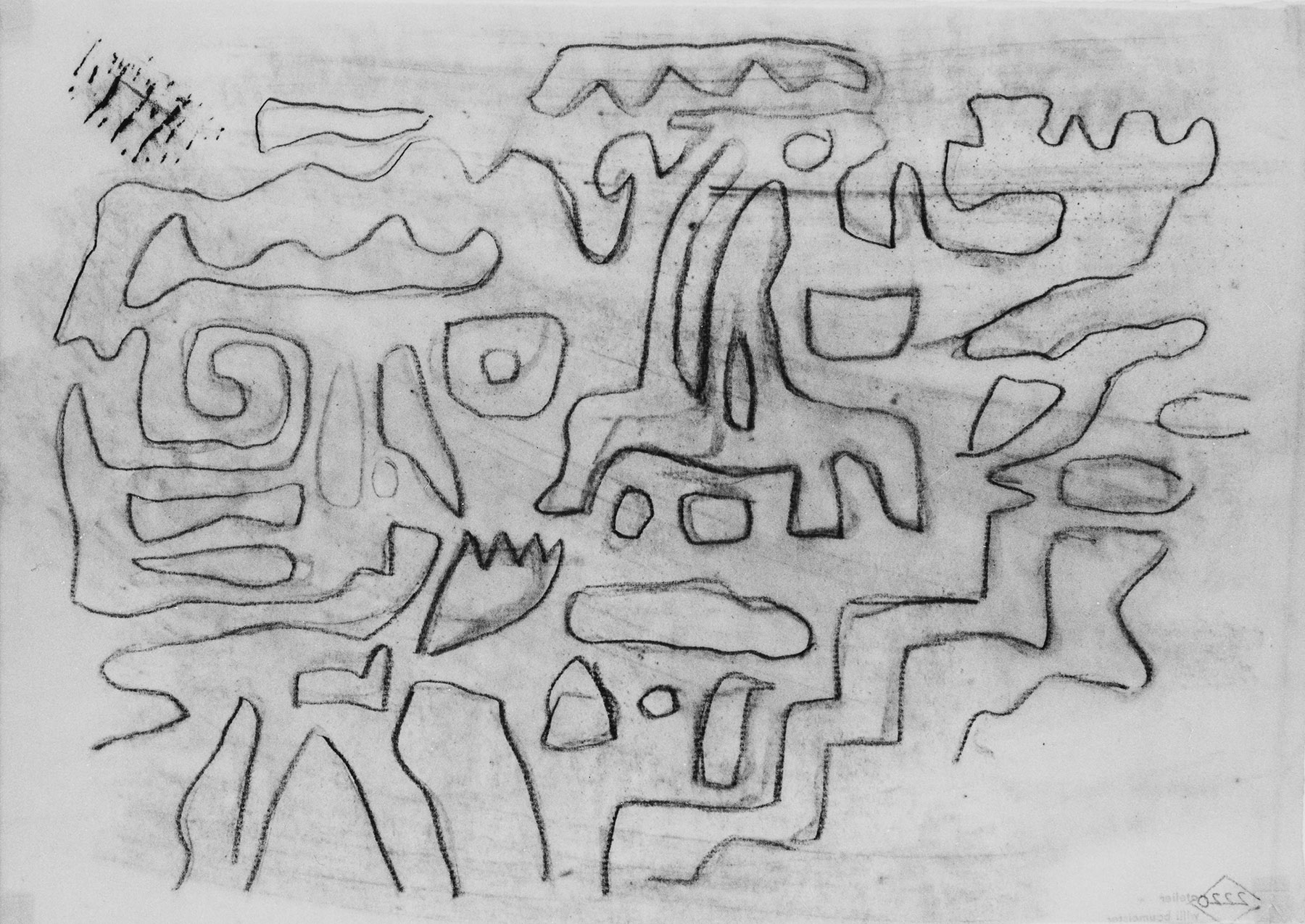Kohle, Bleistift, z. T. mit Druck, Ölkreide in Schwarz, durchgerieben, auf gelblichem, am Rand o. perforiertem, u. ungleichmäßig gerissenem Transparentpapier, verso mit Kohle geschwärzt