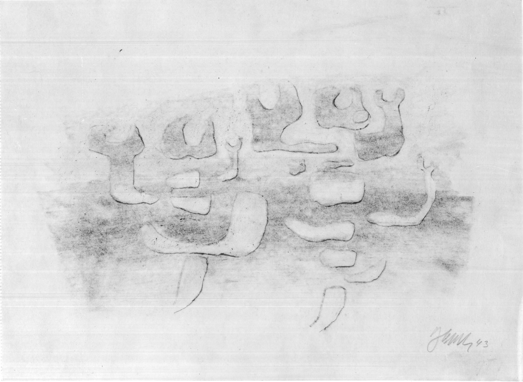 Kohle, gewischt, Bleistift auf gelblichem Papier