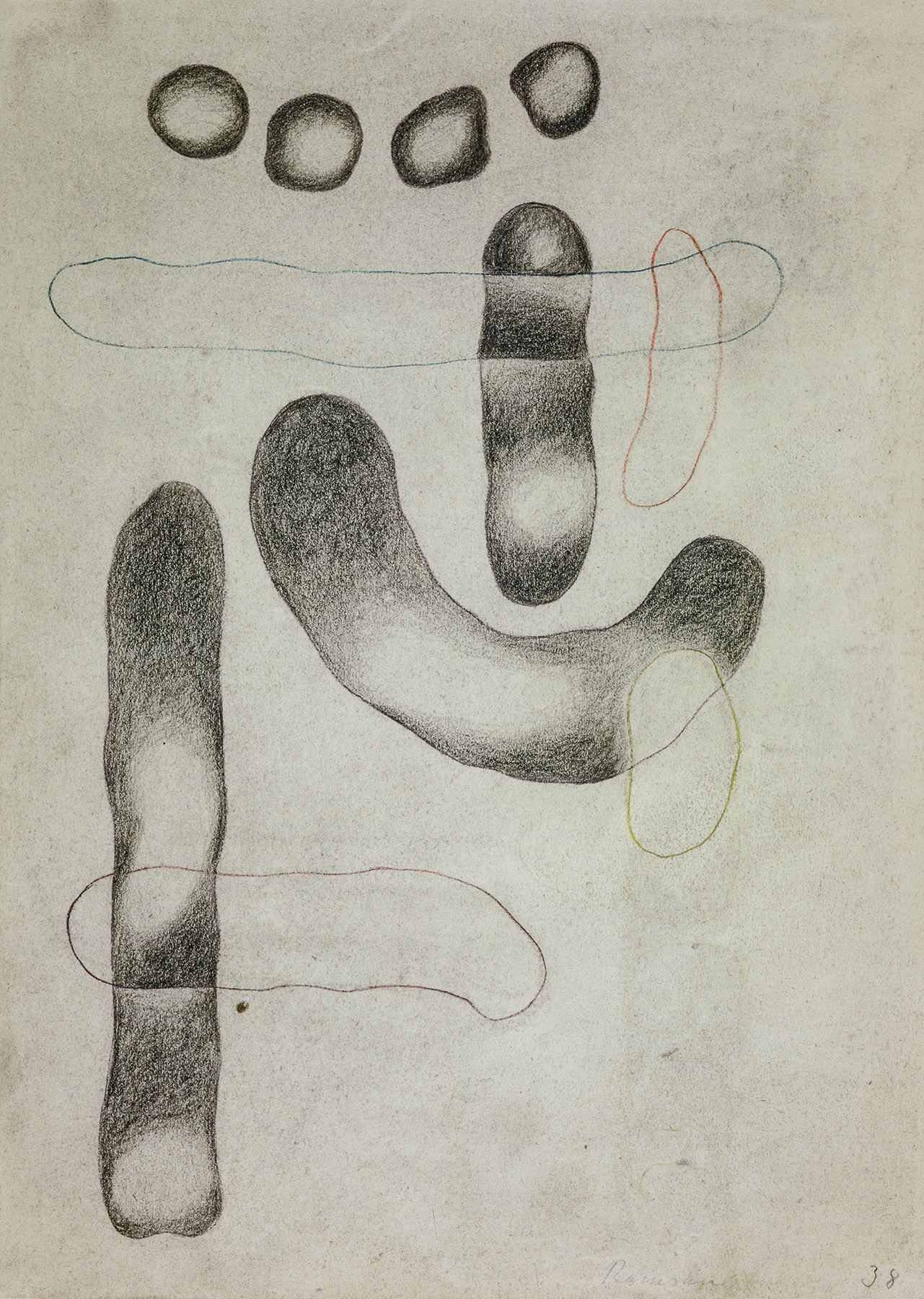 Vgl. Z 691, 695, 696. - Vgl. das von B. auf der Fotohülle „1938“ datierte, verschollene Gemälde, nicht bei G, Foto im Archiv Baumeister. (fkb)   Die Zeichnung entstand während des Ferienaufenthaltes in der Ramsau in Österreich. (fkb)