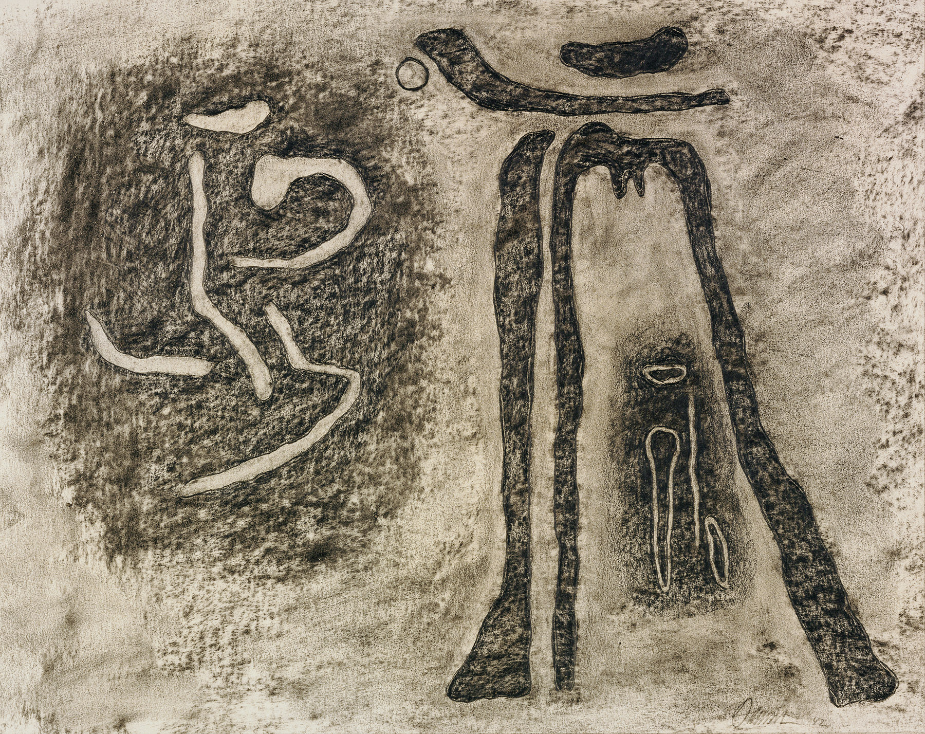 Kohle, z. T. gewischt, Bleistift, fixiert, Konturen geritzt (mit leichten Abweichungen), fixiert, Einfassungslinien (einfach), auf chamoisfarbigem Zeichenkarton
