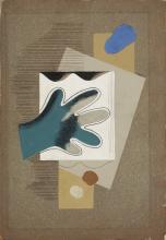 Gouache mit Deckweiß, blau, beige, grün, schwarz; roter, brauner und schwarzer Farbstift, Untergrund Spritztechnik mit Begrenzungslinien, auf links perforierter Zeichenkarton