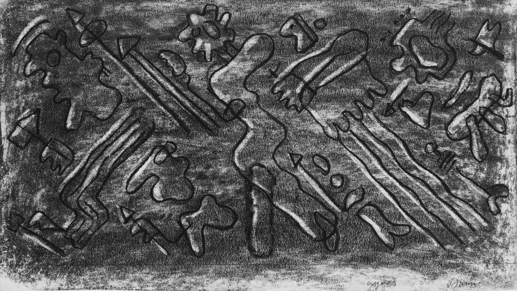 Kohle, gewischt, radiert, Ölkreide in Schwarz, fixiert, Einfassungslinie u., auf chamoisfarbigem, am Rand u. leicht unregelmäßig beschnittenem Zeichenkarton