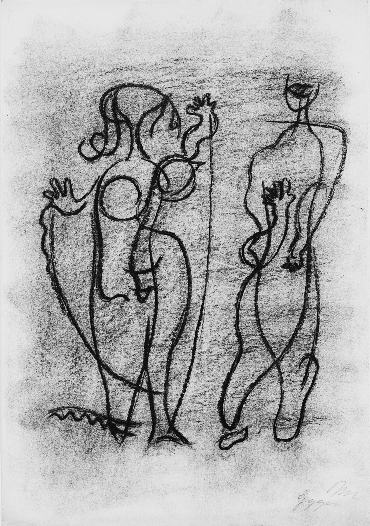 Kohle, z. T. gewischt, Ritzkonturen (Bleistift, Pause, blind), fixiert, auf chamoisfarbigem Zeichenkarton