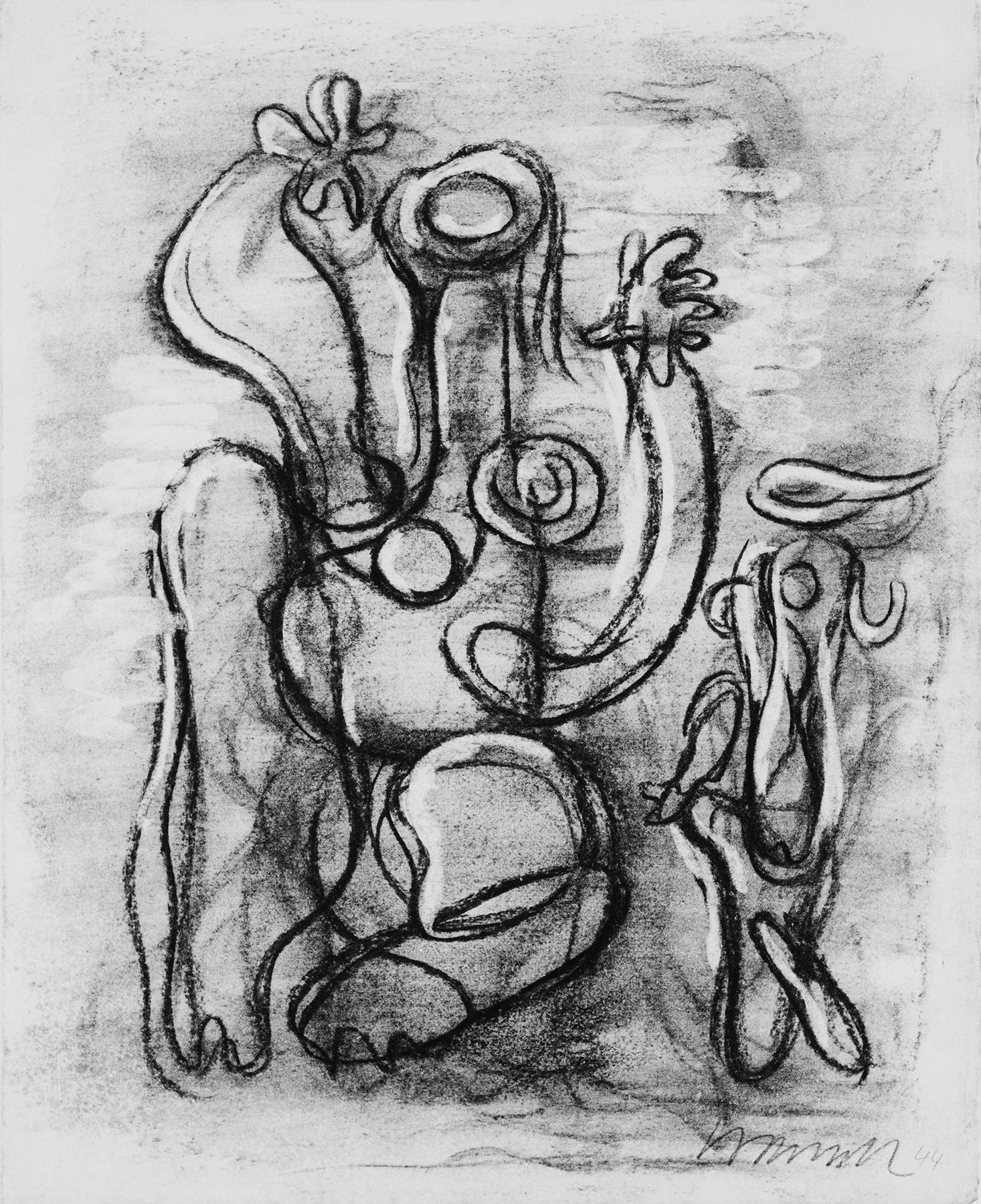 Kohle, gewischt, radiert, fixiert, auf chamoisfarbigem, starkem Aquarellpapier