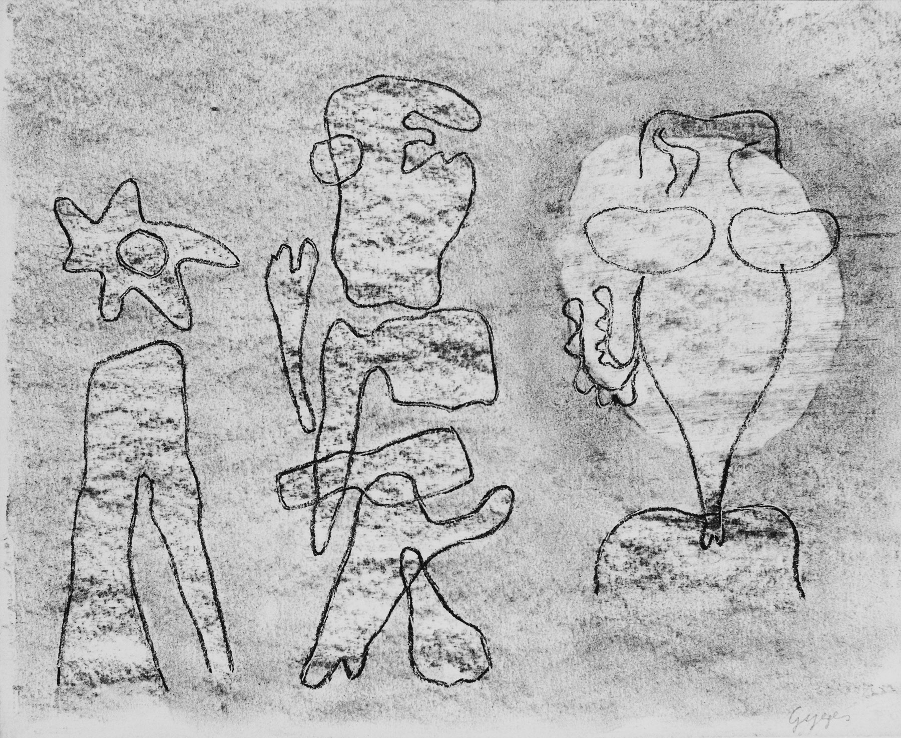 Kohle, gewischt, Ölkreide in Schwarz, Ritzkonturen (blind), fixiert, auf chamoisfarbigem Zeichenkarton, am Rand l. u. Teil eines Prägestempels: SCHOELLERSHAMMER
