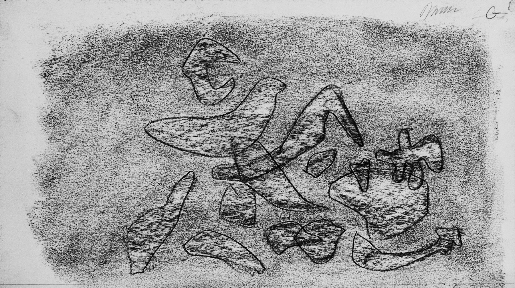 Kohle, gewischt, Ölkreide in Schwarz, fixiert, am Rand u. Einfassungslinie, auf chamoisfarbigem, am Rand u. leicht unregelmäßig beschnittenem Zeichenkarton