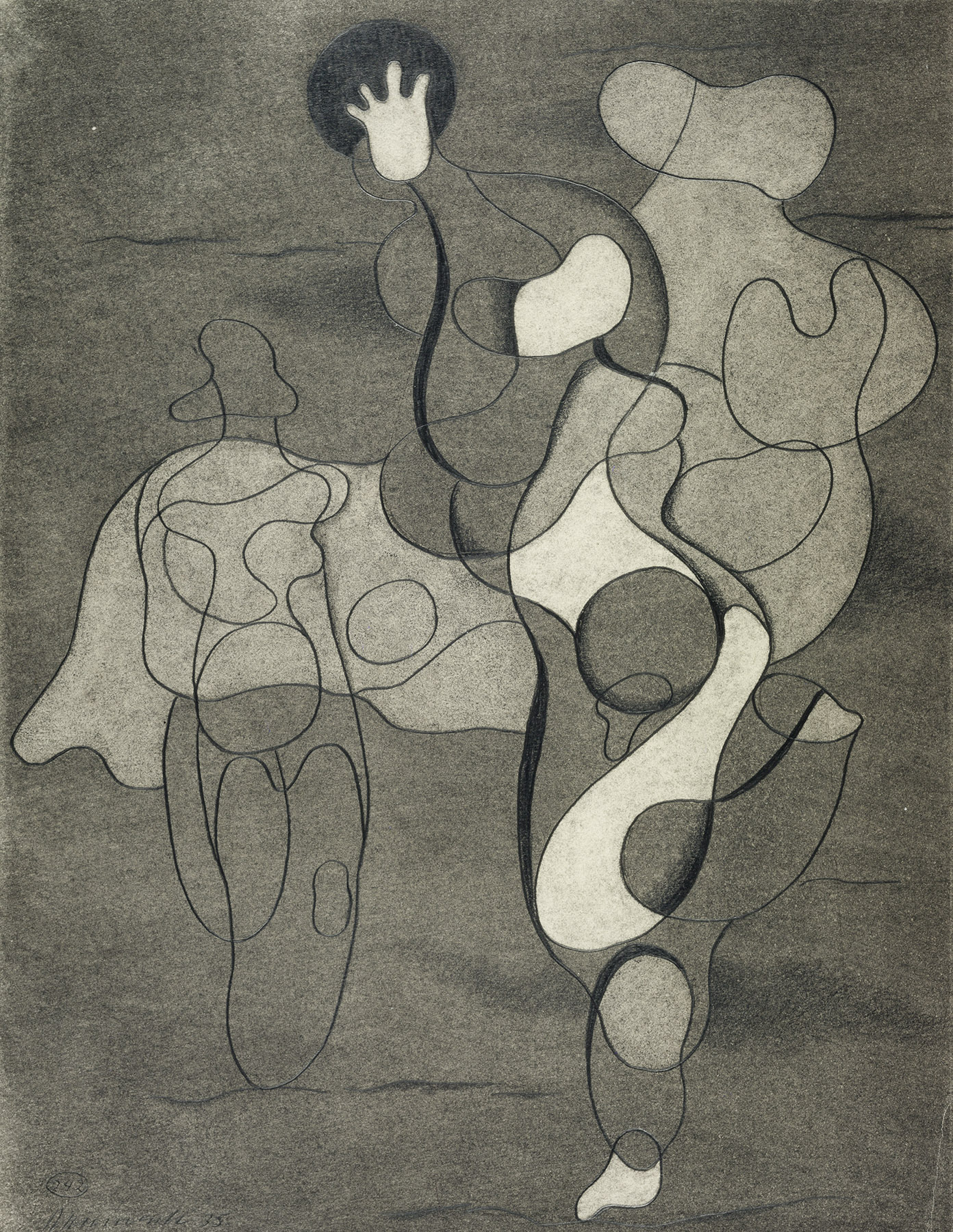 Kohle, gewischt, Bleistift, Konturen vorgeritzt, fixiert, Einfassungslinien, auf chamoisfarbigem, am Rand l. perforiertem Zeichenkarton