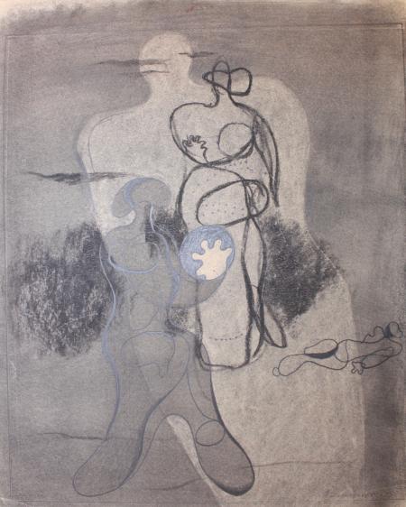 Kohle gewischt mit Bleistift und Ritzkonturen auf Zeichenkarton