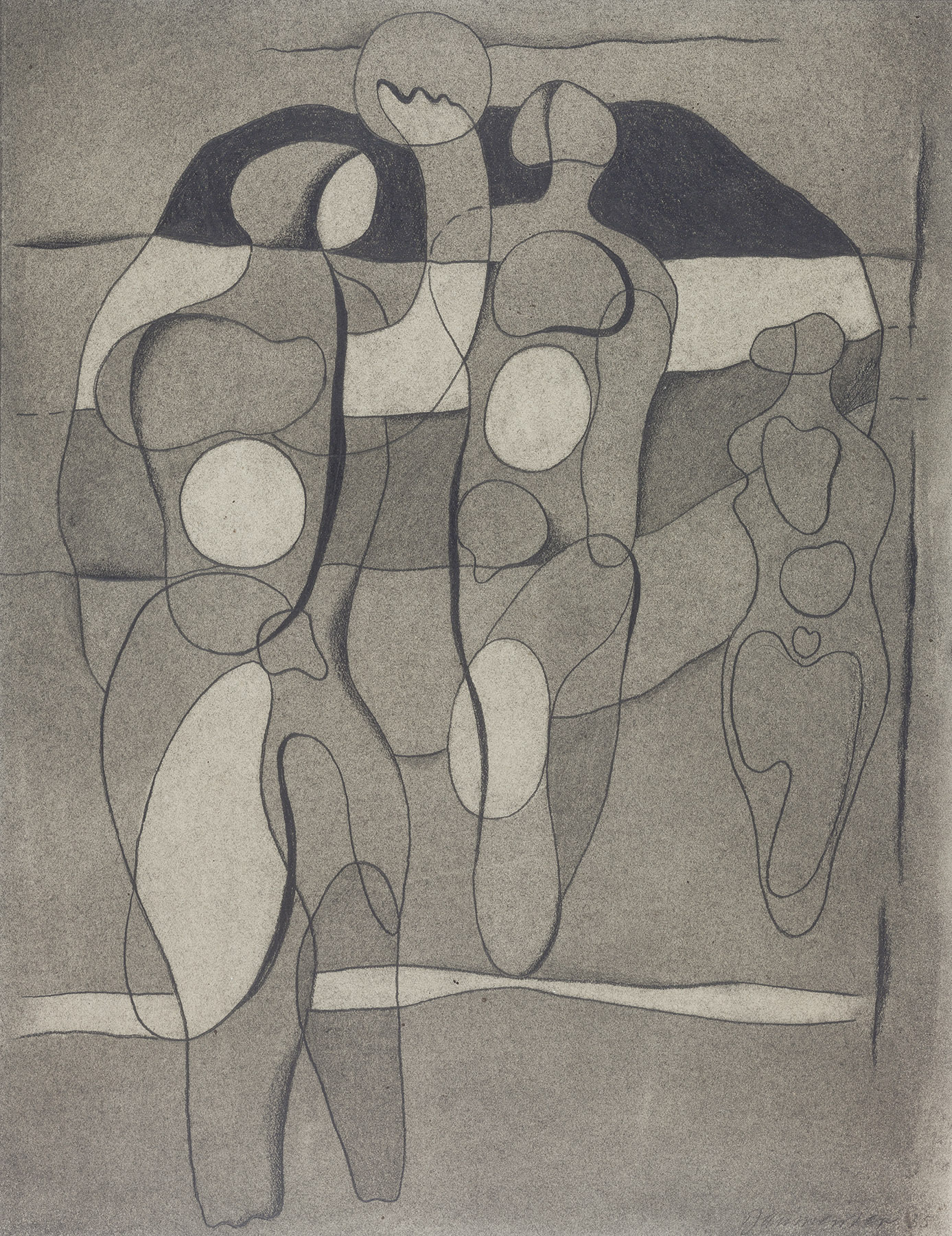 Die rechte Figur erscheint bereits 1930 auf dem von B. datierten Gemälde G 301, seitenverkehrt auf den Zeichnungen 396 und 397. (fkb)