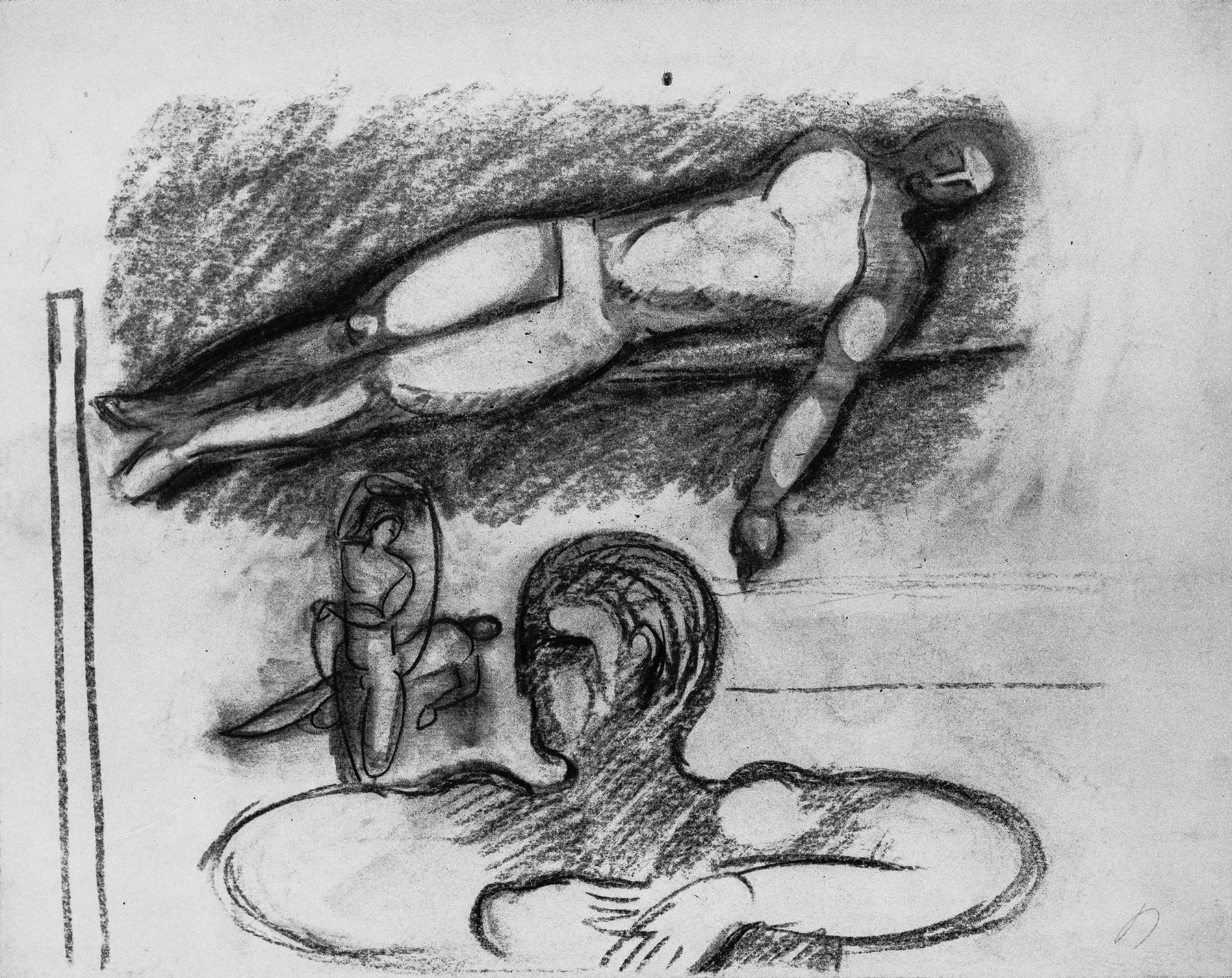 Am unteren Rand eine Repoussoir-Figur in der Art Schlemmers. - Das Motiv der Seilspringerin und der halbliegenden Figur hat B. in einer Studie für Stuckmarmor wieder aufgenommen, und zwar im Zusammenhang mit seinen Forschungen über die Techniken der Wandbilder 1941/42. Vgl. Dr. Kurt Herberts, Wände und Wandbild, Stuttgart 1953, Abb. S. 227-231. (fkb) Zum Motiv der Seilspringerin vgl. das Gemälde G 278 von 1928. (fkb)