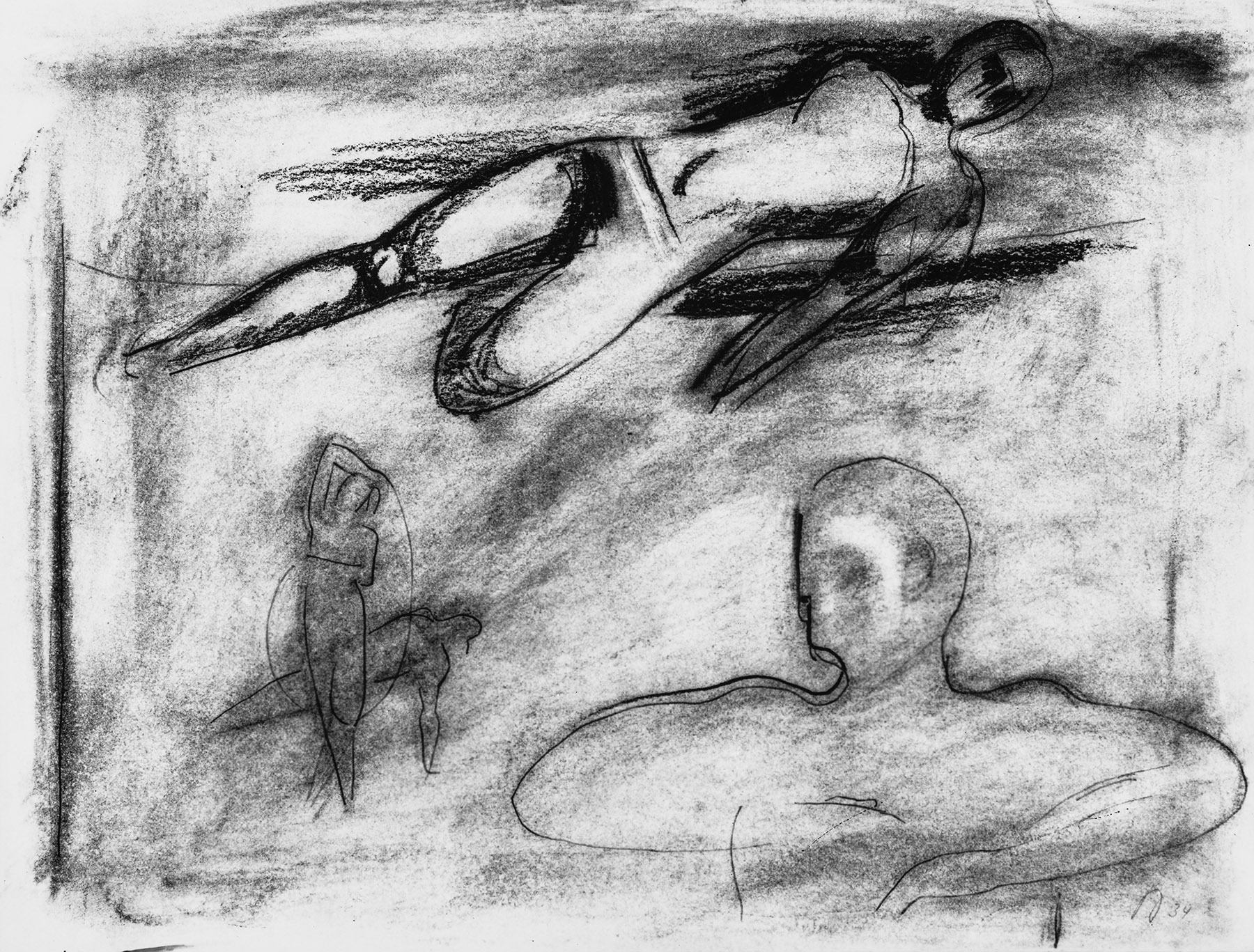 Kohle, gewischt, Ölkreide in Dunkelbraun, Bleistift, Konturen eingedrückt (z. T. gepaust), fixiert, auf chamoisfarbigem Zeichenkarton