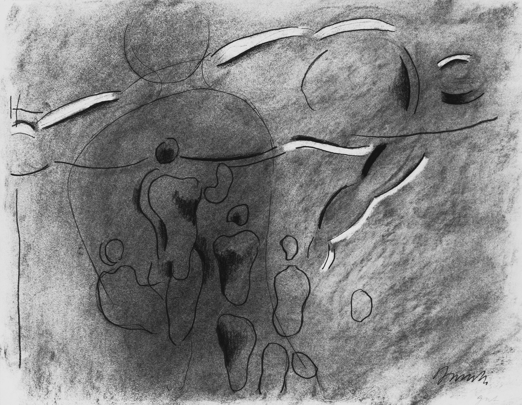 Bleistift, Kohle, gewischt, radiert, auf Papier