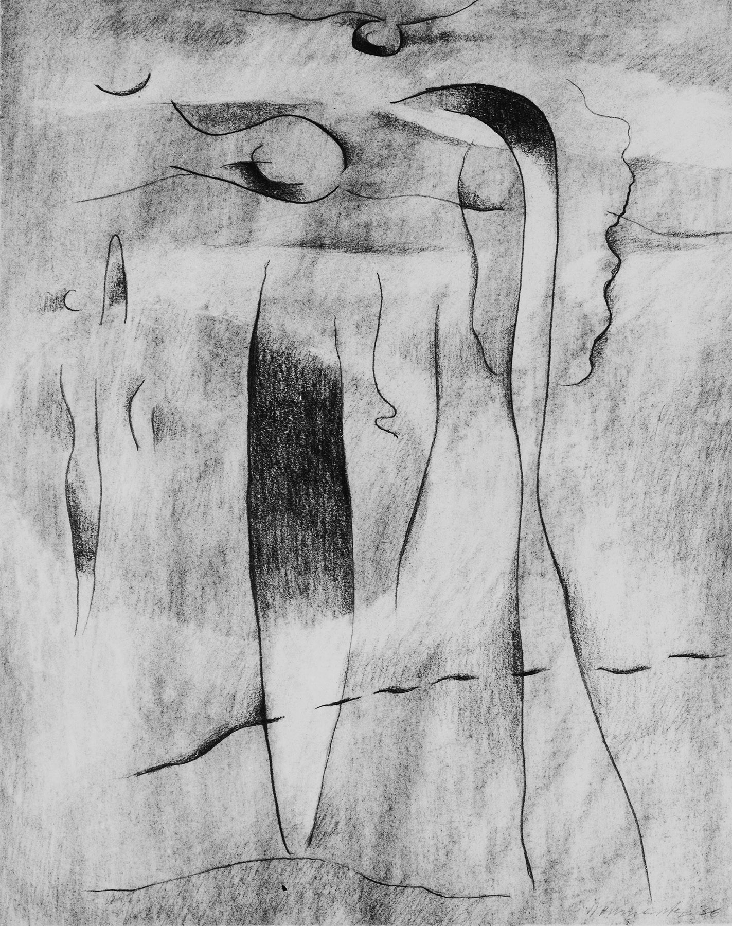 Kohle, gewischt, radiert, Bleistift, fixiert, auf chamoisfarbigem, am Rand l. perforiertem Zeichenkarton, an den Rändern ein ca. 40 mm breiter Streifen radiert