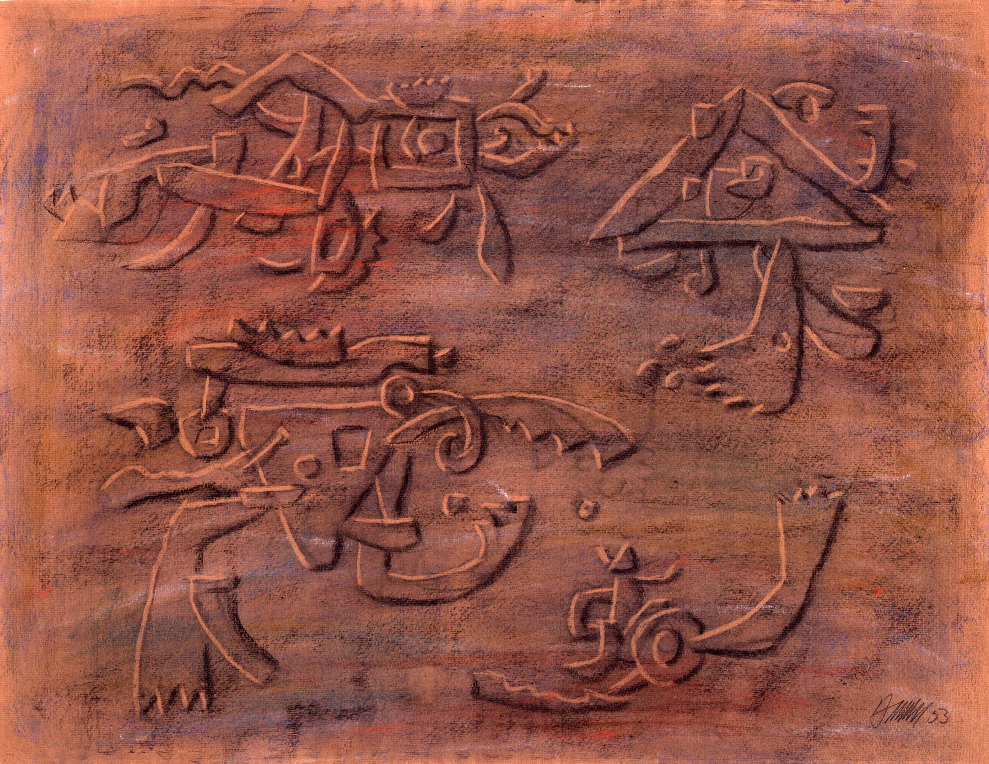 Vgl. das „7.1953“ datierte Gemälde G 1350. Die Laternenform rechts oben sowie die Form mit gezackter Schere links unten wurden von B. auf dem Plakat der Ausstellung zum 65. Geburtstag in Stuttgart 1954 wiederverwendet, vgl. Sp 210, und in: Willi Baumeister zum 65. Geburtstag von seinen Freunden, Stuttgart, 1954, S. 19. (fkb)