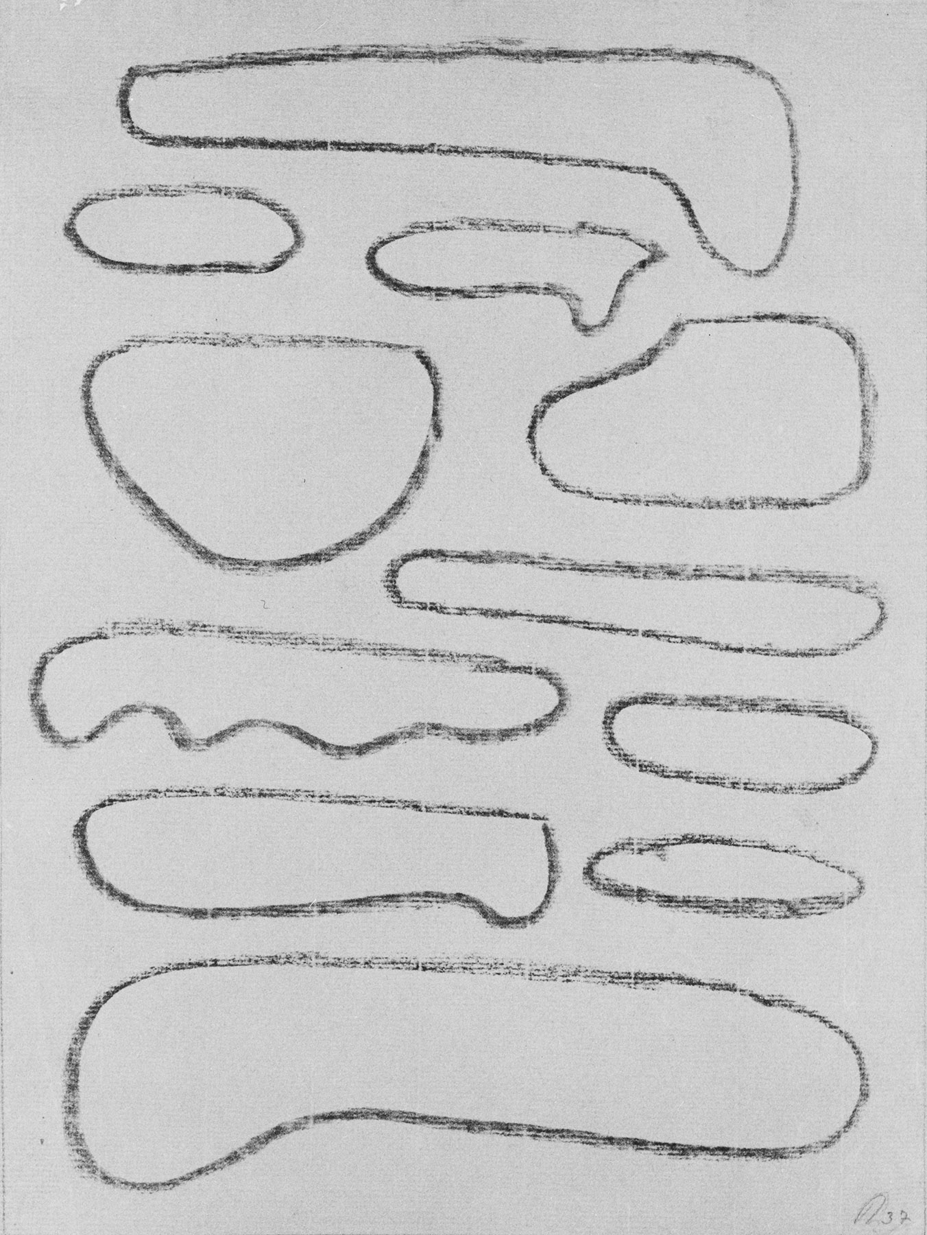 Kohle, fixiert, Einfassungslinien, auf olivgrünem Ingres-Bütten
