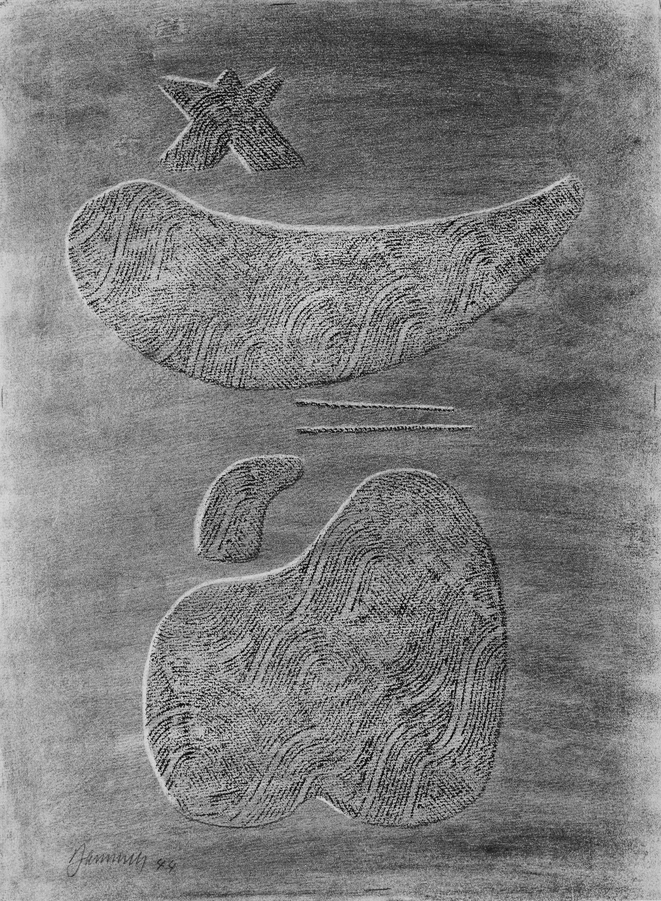 Kohle, gewischt, radiert, Ölkreide in Schwarz, durchgerieben, fixiert, auf chamoisfarbigem Ingres-Bütten mit Wz. l. o.: INGRES und r. u.: CANSON & MONTG...