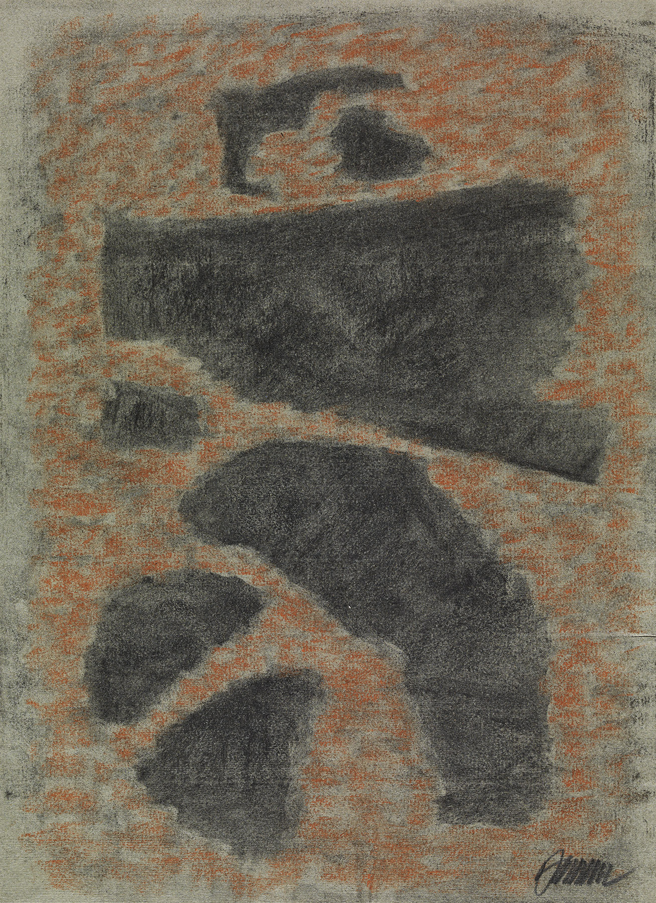 Kohle, gewischt, radiert, Pastell in Rot, fixiert, auf graugrünem, am Rand l. perforiertem Ingres-Bütten