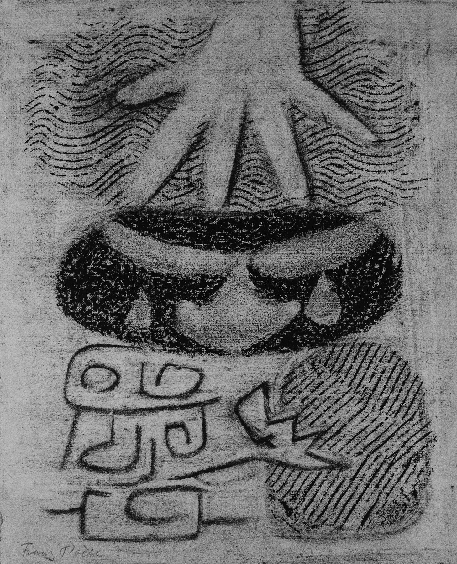 Kohle, gewischt, Ölkreide in Schwarz, durchgerieben, fixiert, auf beigefarbigem Ingres-Bütten