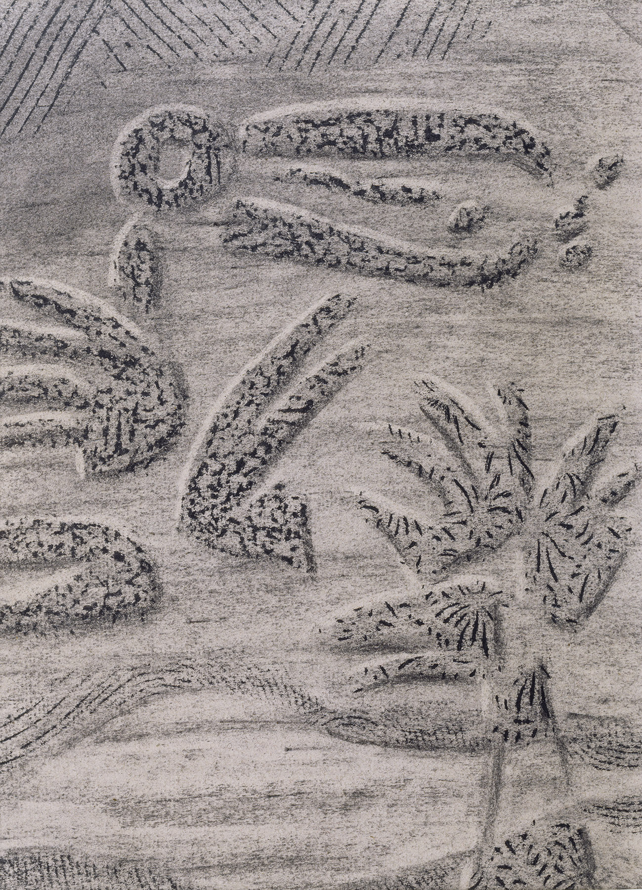 Kohle, gewischt, radiert, Kreide, auf Bütten